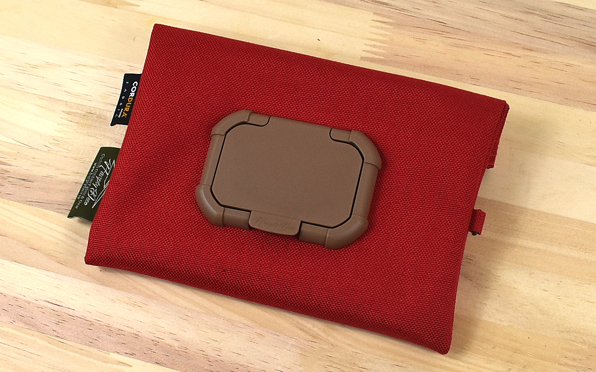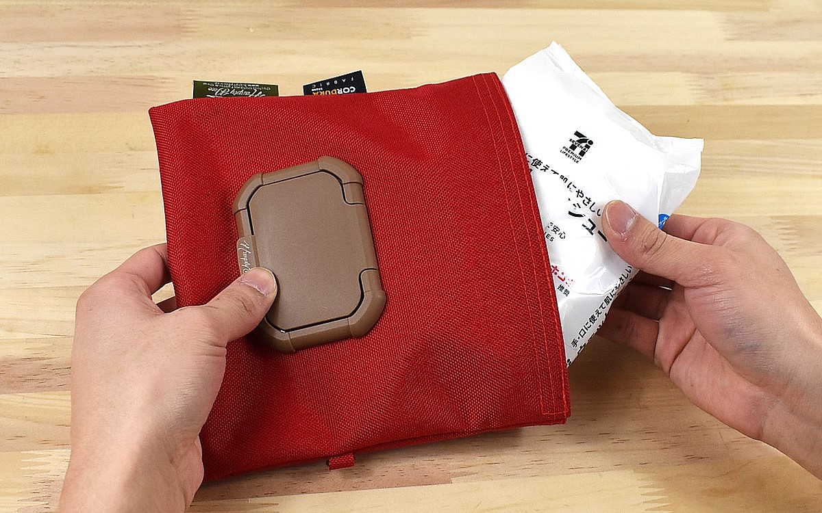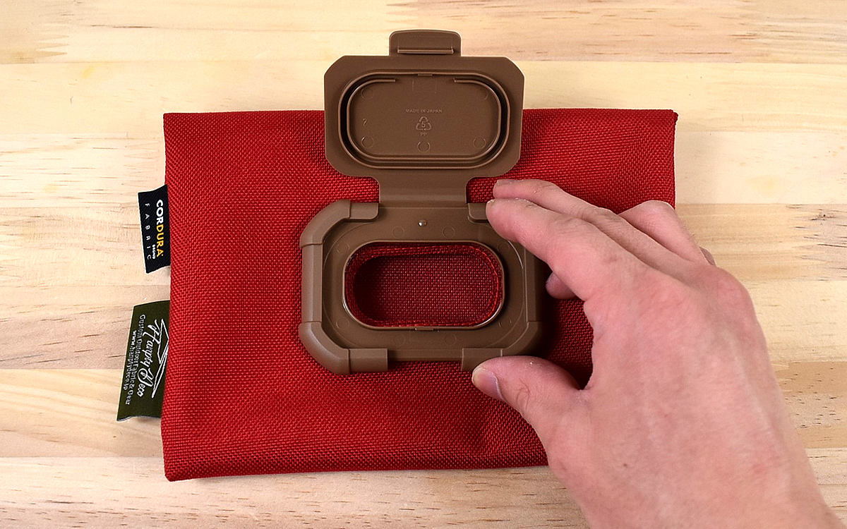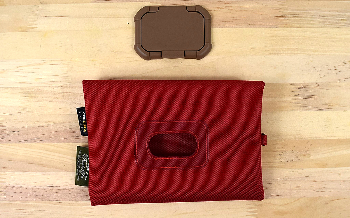 丈夫で厚手な「コーデュラナイロン」を使用したポーチに、密封性の高いフタが取りつけられている同商品。中には約16(幅)×11(高さ)×4cm(厚み)以内の袋型ウェットティッシュを収納することが可能です。