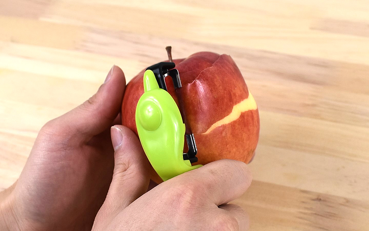 T字の状態でも十分使いやすい形ですが、刃の部分を縦向きにすれば食材を横にスライドさせて皮むきできるように。リンゴの皮をらせん状にむくテクニックも、包丁より簡単に実践できました。