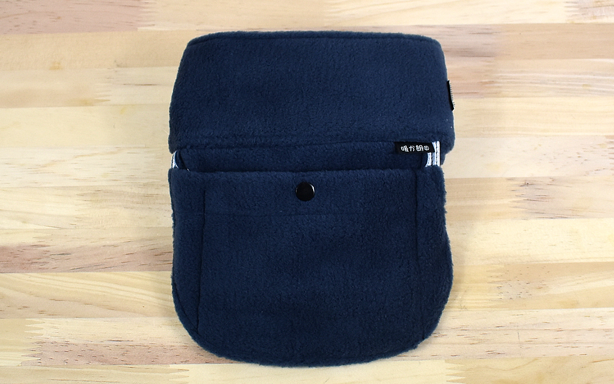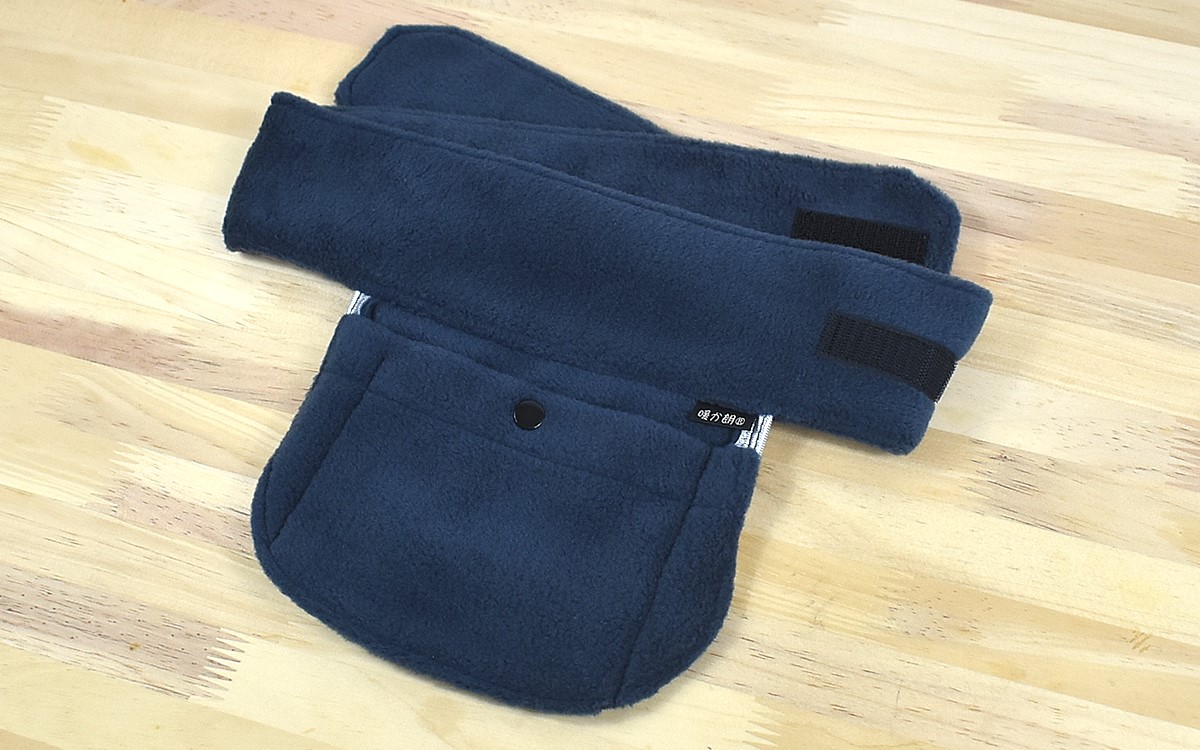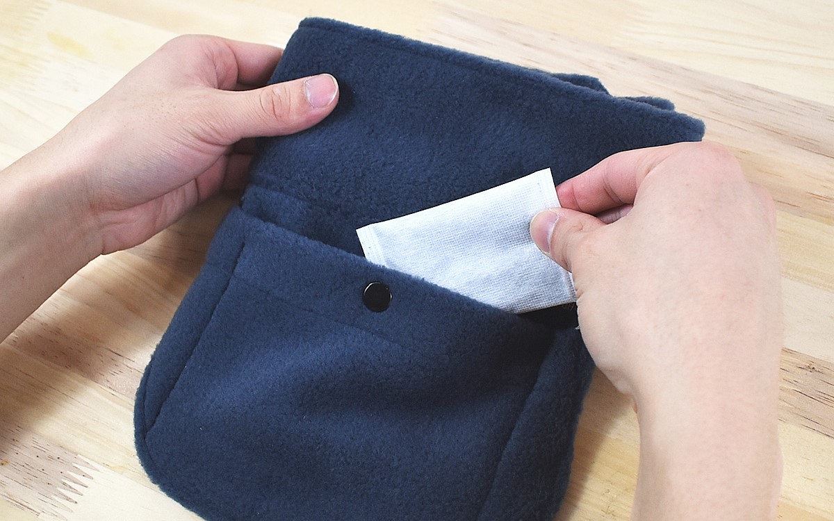 同商品は、ポリエステル100%素材のフリース素材で作られたネックウォーマー。約80(長さ)×12cm(幅)ほどの長さで、両端にはマジックテープがついています。さらに首の後ろに当たる部分に、使い捨てカイロを収納できるポケットつき。さっそくミニサイズのカイロを開封し、ポケットに入れて首に巻いてみましょう。
