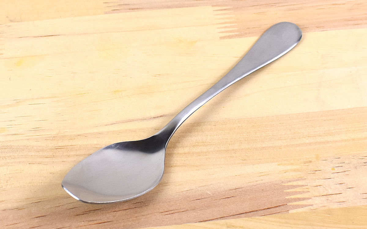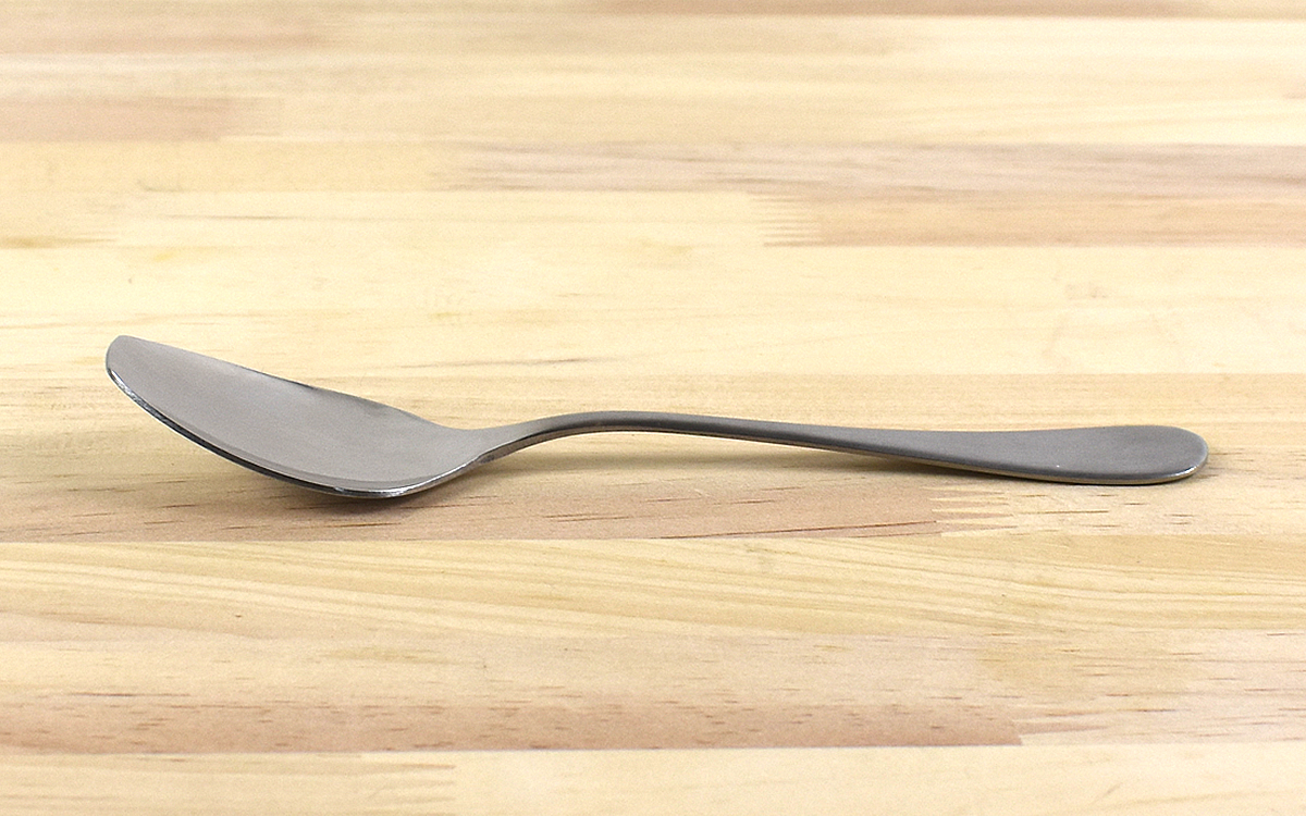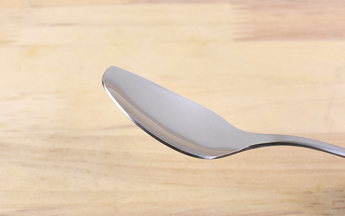 同商品は、長さ185mmほどの18クロームステンレス製スプーン。金属特有のツヤを抑えた質感がとても上品なカトラリーです。