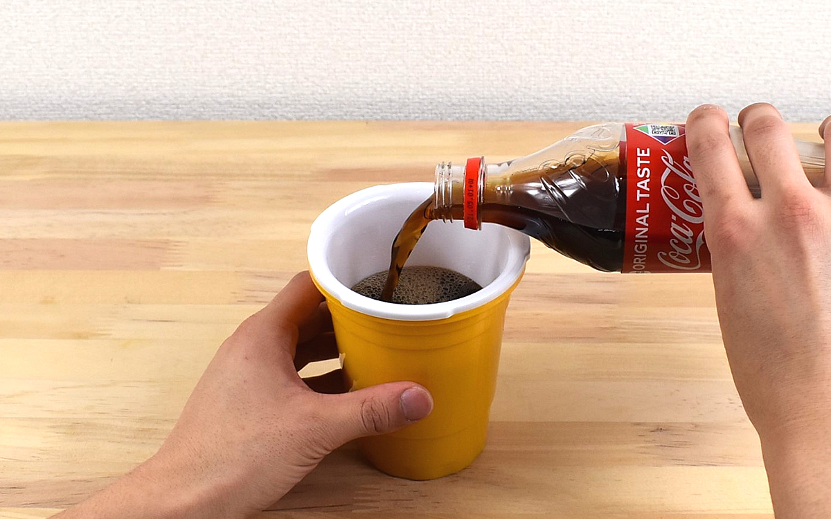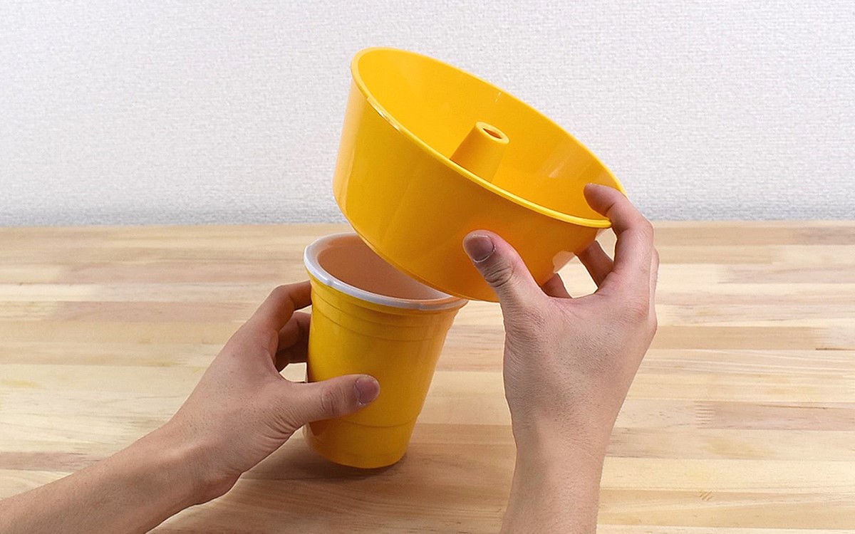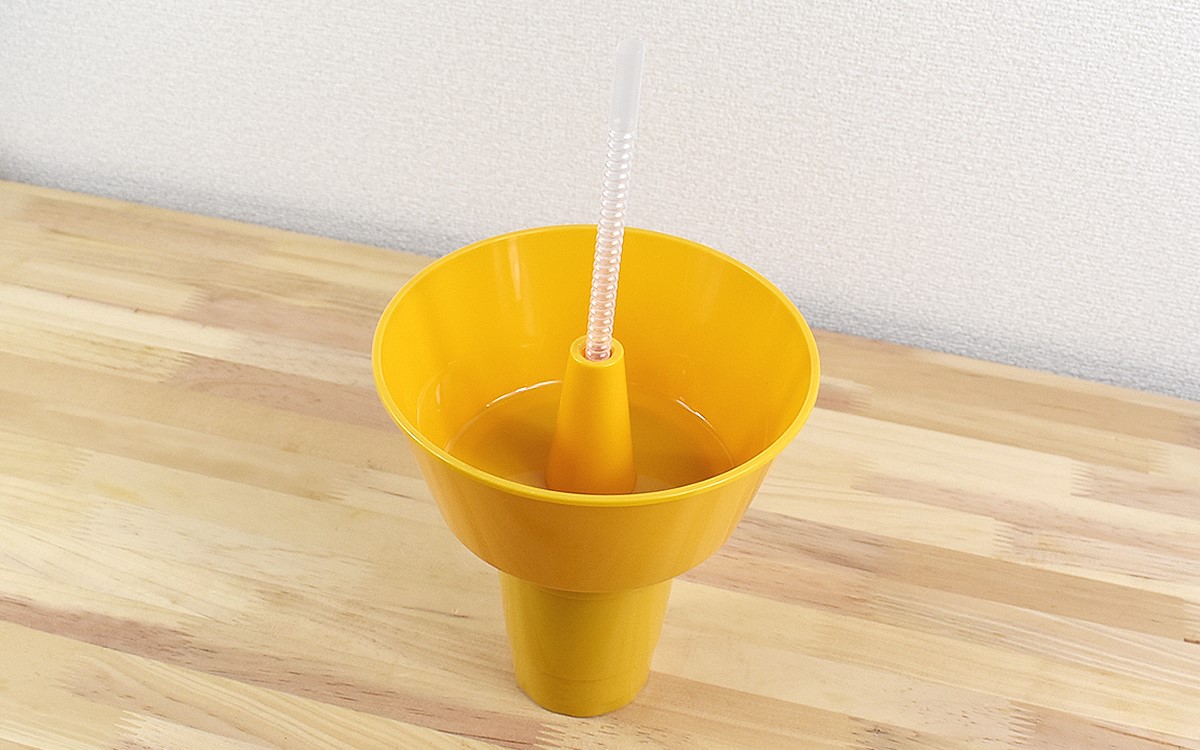 使い心地を確かめるべく、さっそくセッティング開始。まずはパーツを分解してタンブラーに好きな飲み物を注ぎましょう。次にスナックタブを回しながらはめ、カチッと音が鳴ったら準備完了。あとは真ん中にストローを差せば、スナックとドリンクをワンハンドで楽しめるアメリカンスタイルのできあがりですよ。
