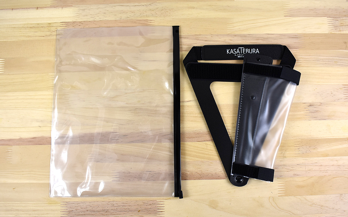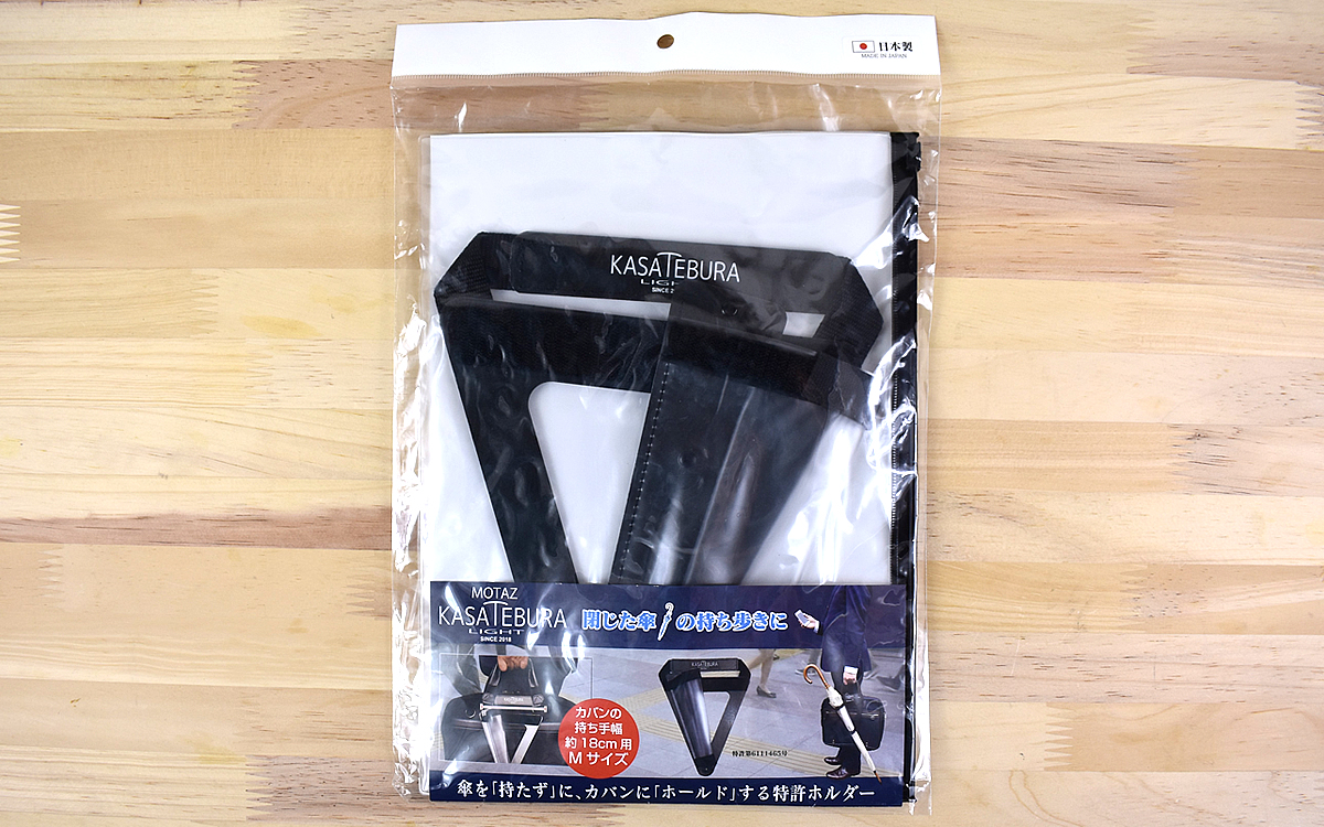同商品は、ポリエチレン製のベルトにポリ塩化ビニル製の筒が取りつけられた傘専用ホルダーと収納バッグのセット。今回ゲットしたMサイズは幅18cmまでの持ち手に対応しており、全体は約245(長さ)×195mm(幅)ほどの大きさです。