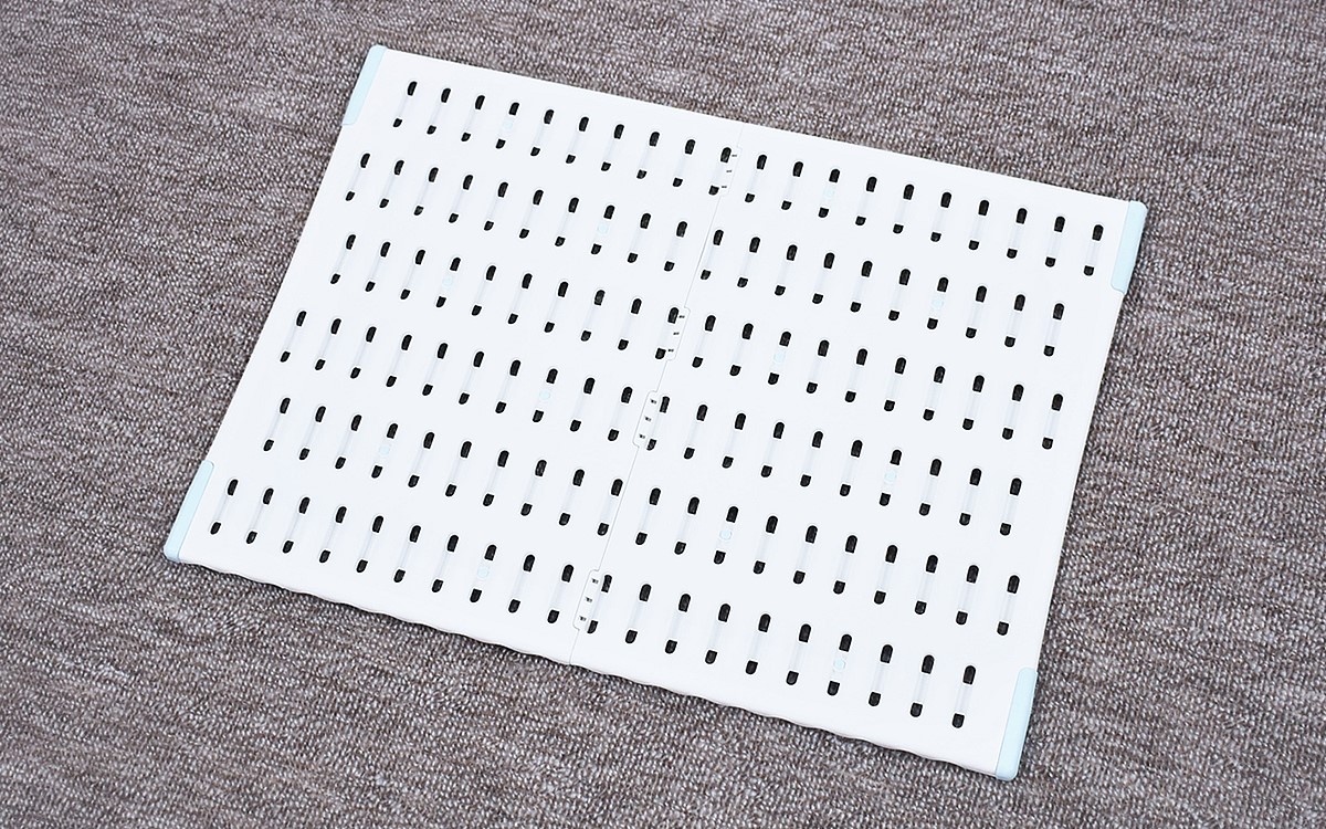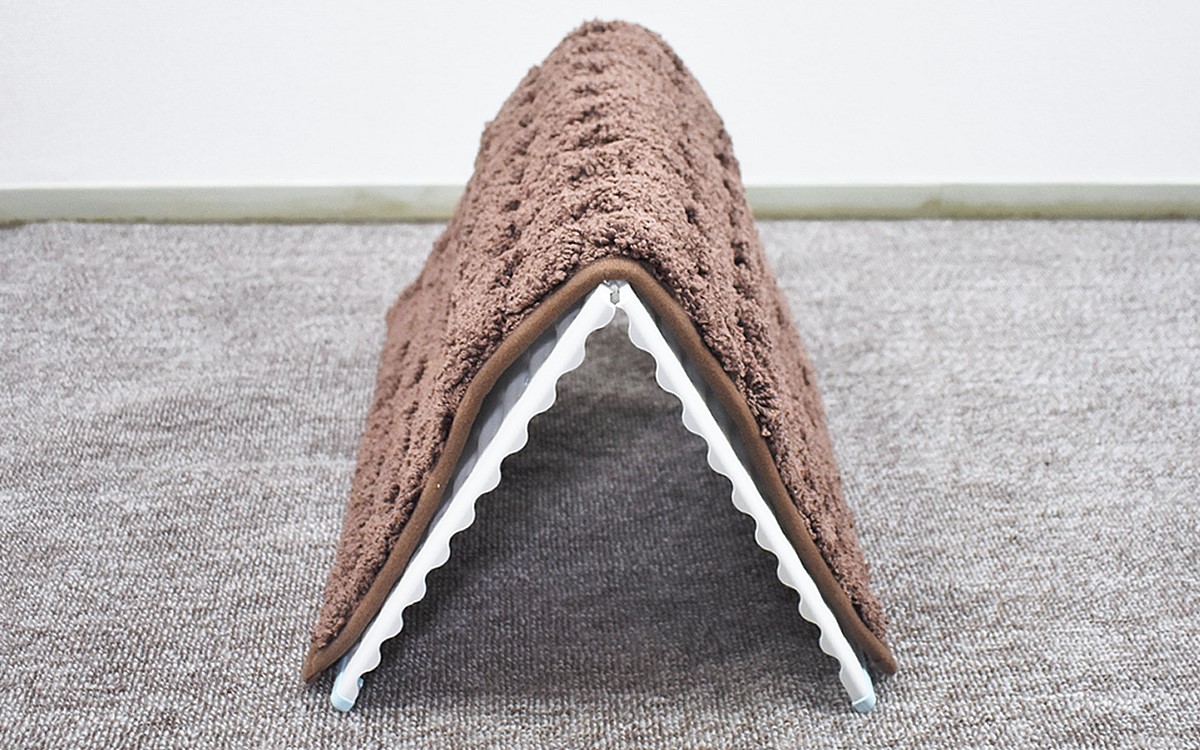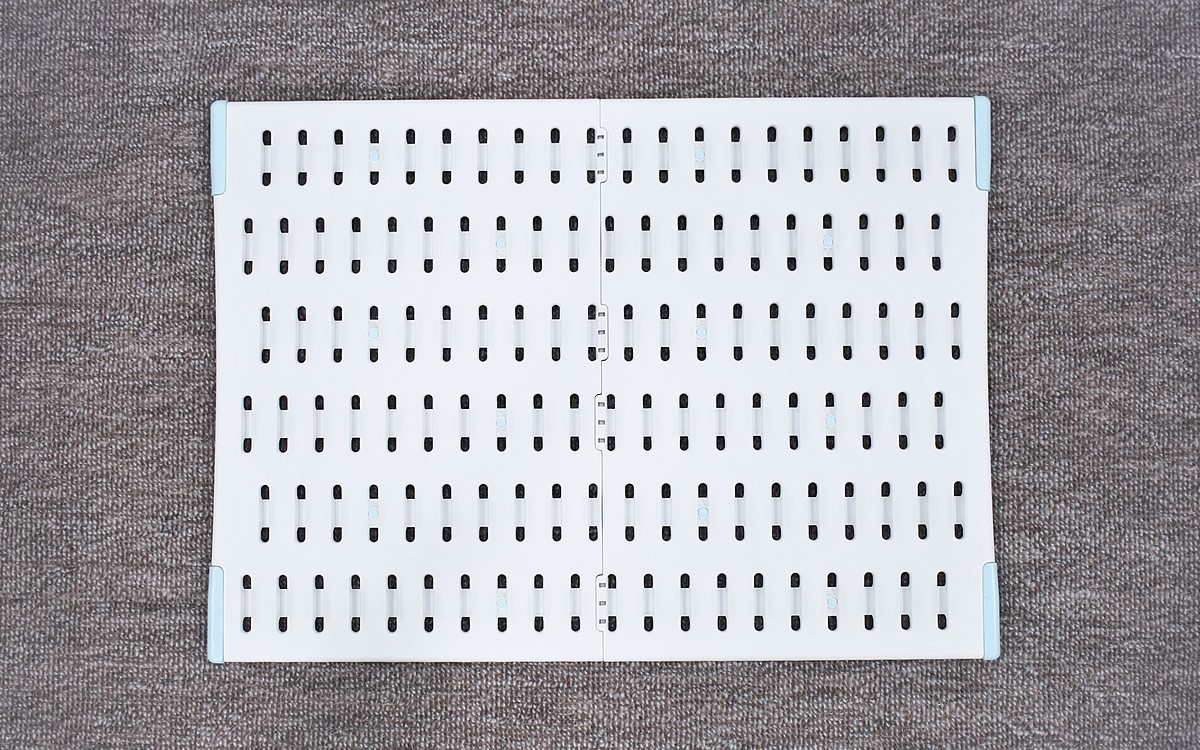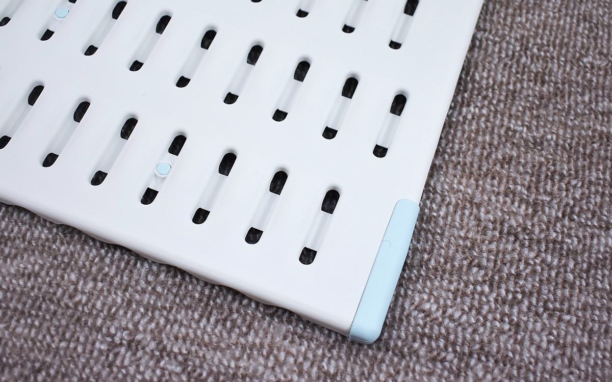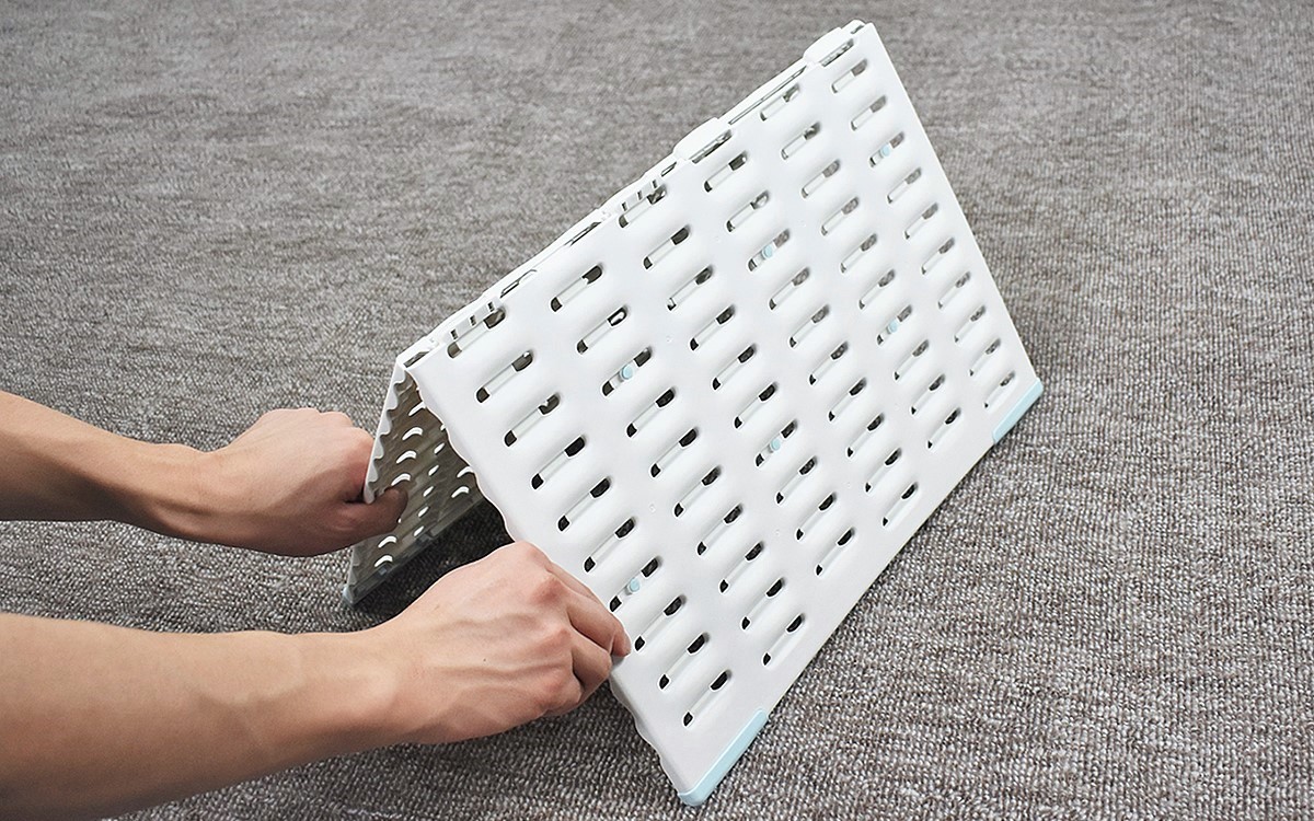 バスマットを使い終わったら、ボードの真ん中を持ち上げて山型に。ボードの通気性がアップして、バスマットが早く乾くようになりました。ボードを使わないときは2つに折りたためば、ちょっとした隙間に収納することが可能。軽量で持ち運びもしやすく、お手入れも簡単ですよ。