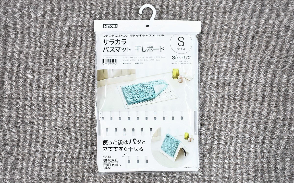バスマットは脱衣所に上がる際、床がびしょびしょになるのを防ぐために欠かせないアイテム。実家にいたころは毎日のように取り替えていたのですが、1人暮らしを始めてからは同じマットを長期間使うようになりました。少し不衛生な気はするものの、毎日洗濯するのはかなり面倒。そんな悩みを簡単に解決できるアイテムが、ニトリの「バスマット干しボード(サラカラ S)」(1415円/税込)です。