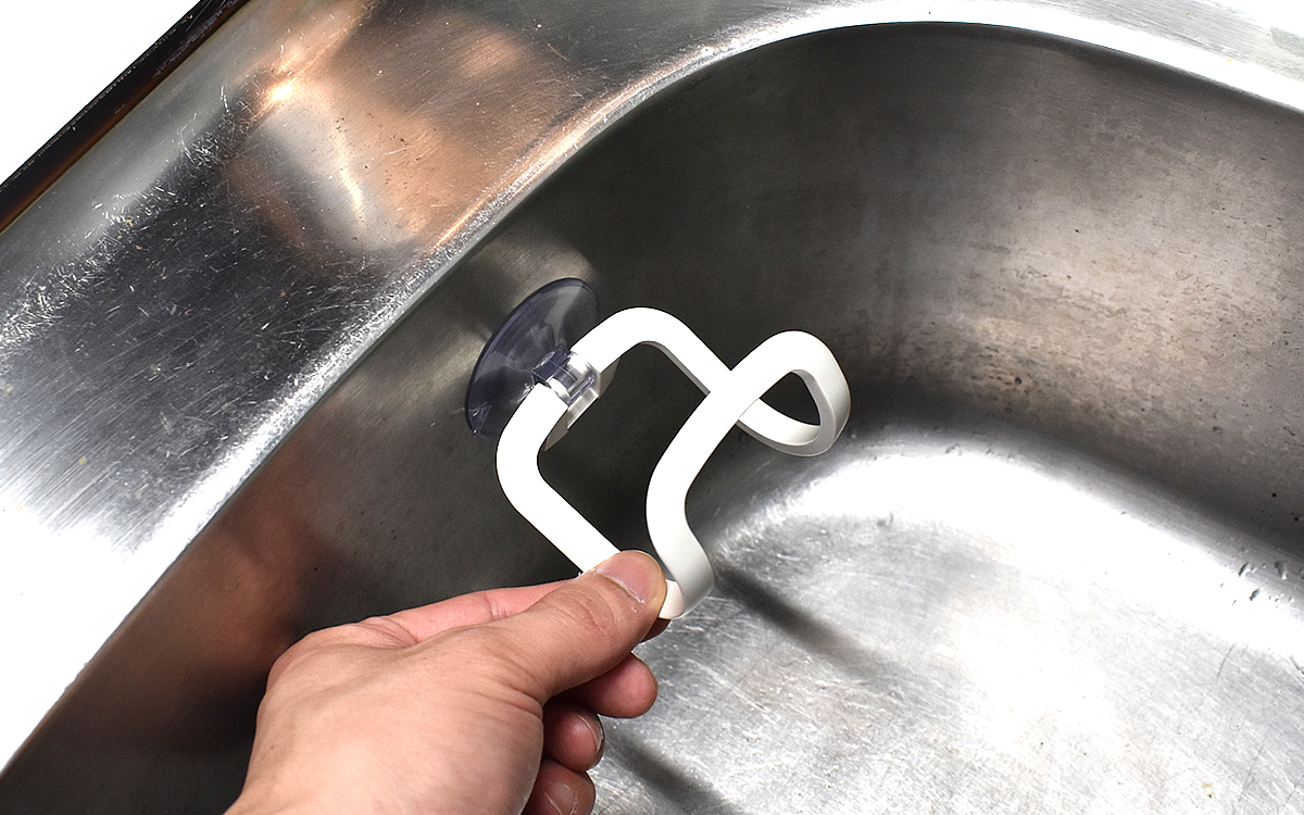 シンプルで無駄のないデザインのおかげで、シンクに貼りつけても邪魔になりません。上からも横からもスポンジを取りやすく、サッと食器洗いを始められました。さらにホルダー部分を上向きに角度を変えることができるため、シンクの掃除もスムーズに。スポンジの裏に当たる部分まできれいに磨くことができます。