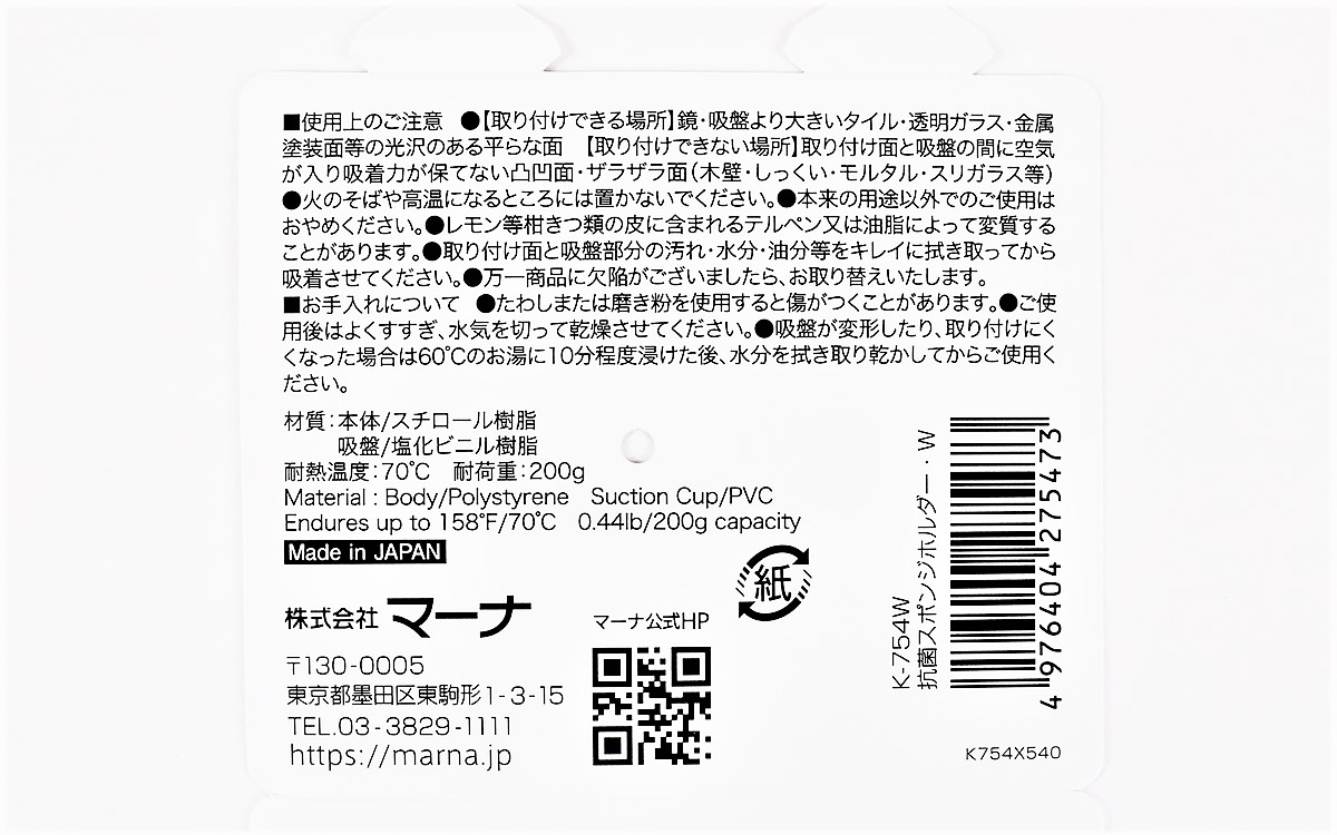 スチロール樹脂製のなめらかな本体に、塩化ビニル樹脂の吸盤がついている同商品。大きさは65(幅)×66(奥行)×70mm(高さ)ほどで、置いたスポンジが斜めに傾くようゆるいカーブを描いています。ホルダー本体には抗菌剤が入っていて、雑菌が繁殖するのを予防してくれる仕組み。使用済みのスポンジでも安心して置くことができますね。