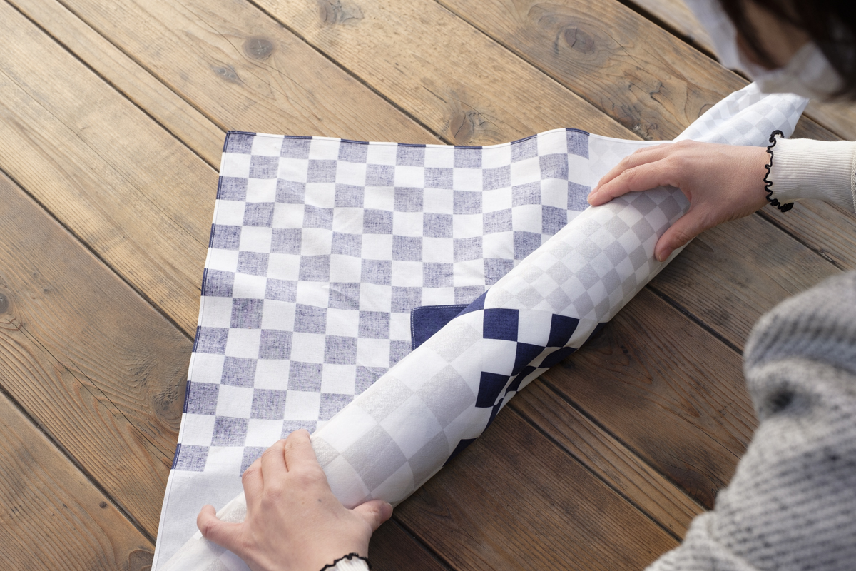 古結 お弁当箱を包むようなシンプルな包み方で、中身もしっかり安定させることができます。リバーシブルのふろしきでしたら、結び目に裏面を出してアクセントにすることもできます。