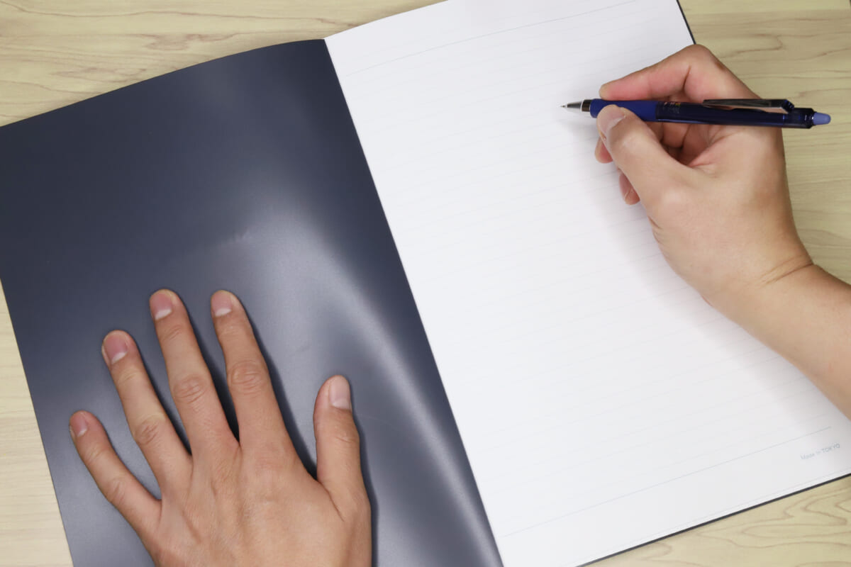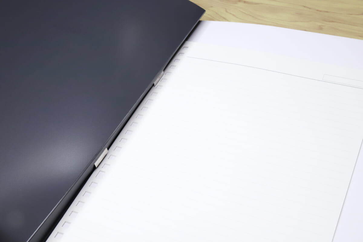 まず、クリップを背パーツで押さえる構造のため、表紙の開閉がかなり硬い。机に置いて180度開くだけでも、手でグイッと押さえる必要があるのだ。そのため、ノド側(ページを見開いた際の中央付近)への書き込みがかなりやりづらい。もしかしたら、筆記時は紙をバラして使って、書き終わったものを閲覧用に再クリップする、というのがラクなのかも。