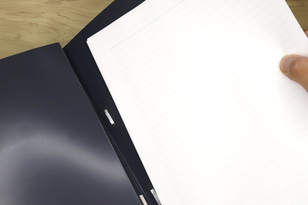 さらに、ファイルバインダー要素を強めに考えれば、ノート用紙以外にも、プリントアウトした資料や小冊子も挟んでファイリングが可能だ。議事録をとったノートページの次に、もらった資料を挟む、といった使い方をすれば、一冊で仕事内容を集約した業務ノートだって簡単に作れるのである。