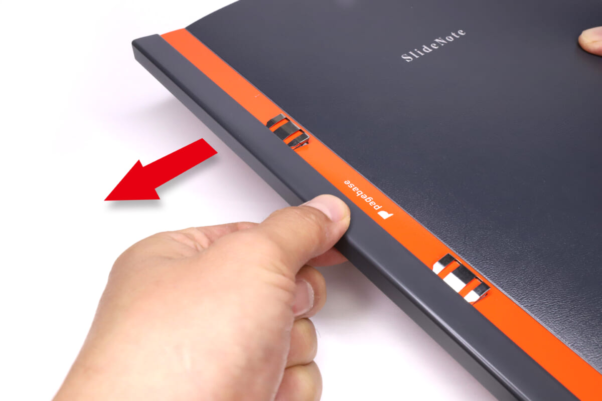 背の部分をつまんで外向きに引っ張ると、クリップがオープン。適当に紙を差し込んだら、背を再びスライドさせて戻す。するとクリップが紙を挟んで固定する。これで元通り、ノートとして使える状態になるという仕組みだ。
