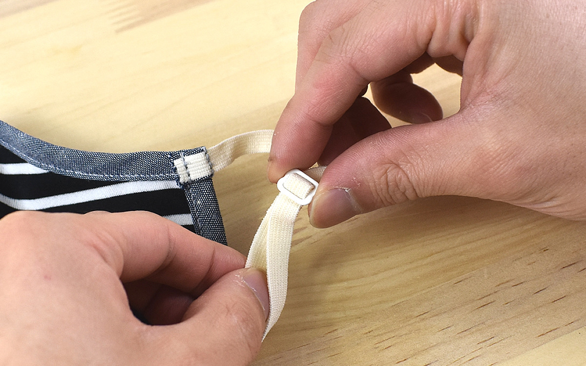 耳にかけるゴム部分にはアジャスターがついており、顔の大きさに合わせて調節が可能。幅広のゴムなので、ぴったりフィットする位置で固定すれば耳が痛くなりにくいのもうれしいポイントです。