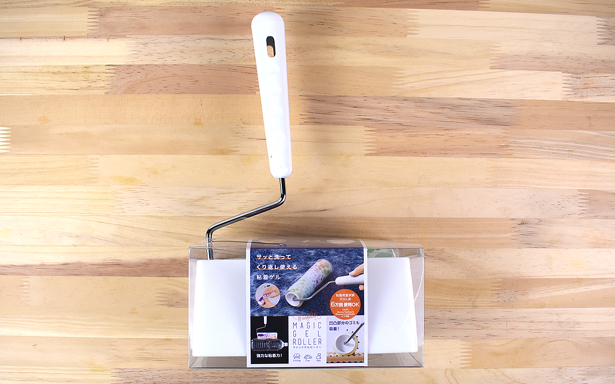 床に落ちたホコリや髪の毛などを取り除くときには、粘着テープのついたローラータイプのクリーナーが便利で、私も自宅のリビングに常備してあります。先日、交換用のテープを切らしてほうきとちり取りで床を掃除するハメになり、ストックを買おうと東急ハンズに立ち寄った時に「マジックゲルローラー」(2200円/税抜)を発見しました。芯を交換しなくても繰り返し使えるローラークリーナーです。