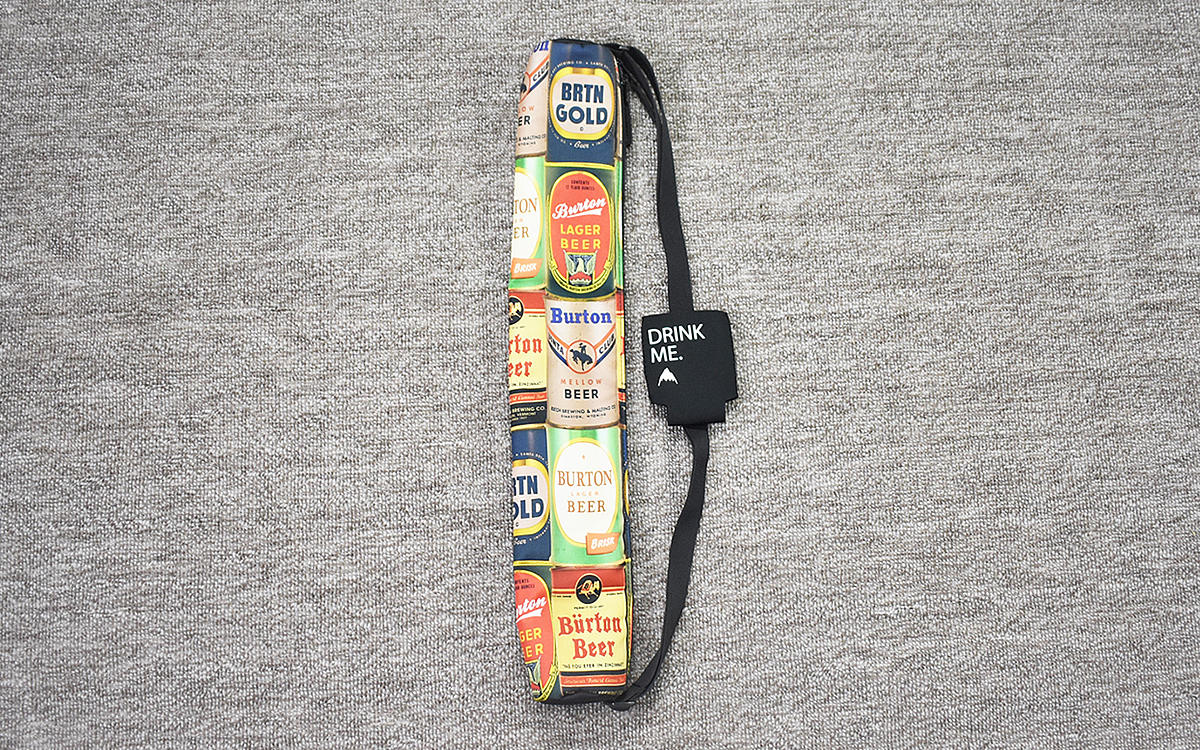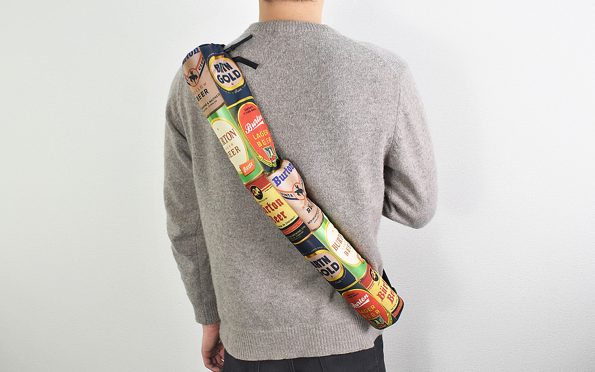 「600Dポリエステル」を使った生地に、カラフルな缶ビールが並んだ柄がプリントされている同商品。大きさは8(幅)×8(奥行)×66cm(長さ)ほどで、肩掛けできるショルダーストラップがついています。