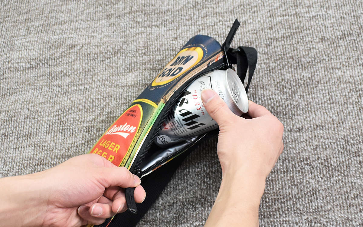 バッグの裏地にはアルミのようにツヤのあるPU生地が使われ、缶を5本分積み重ねられるサイズ。ファスナーは縦についていて、スムーズに出し入れすることが可能です。