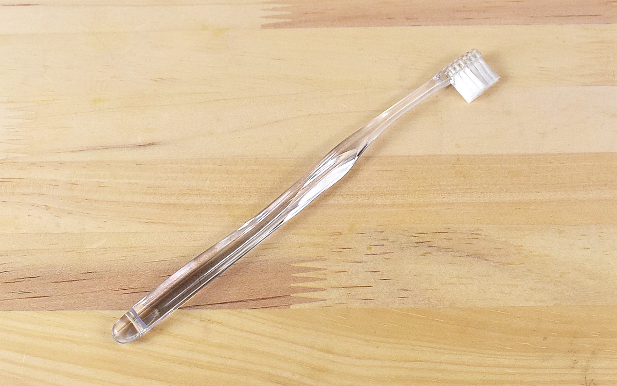 クリアな飽和ポリエステル樹脂製のボディに、ナイロン製のブラシがついている同商品。180(長さ)×11mm(厚み)ほどのサイズで、側面にはロゴがプリントされています。
