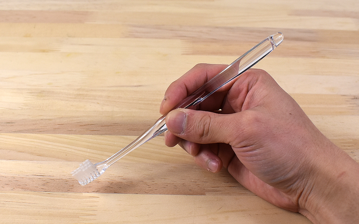 持ち手の上部には指を支えるくぼみがあり、ペンのように持つのが理想的。ぎゅっと握るよりも小回りが利いて、歯茎に負担をかけずに磨ける持ち方です。