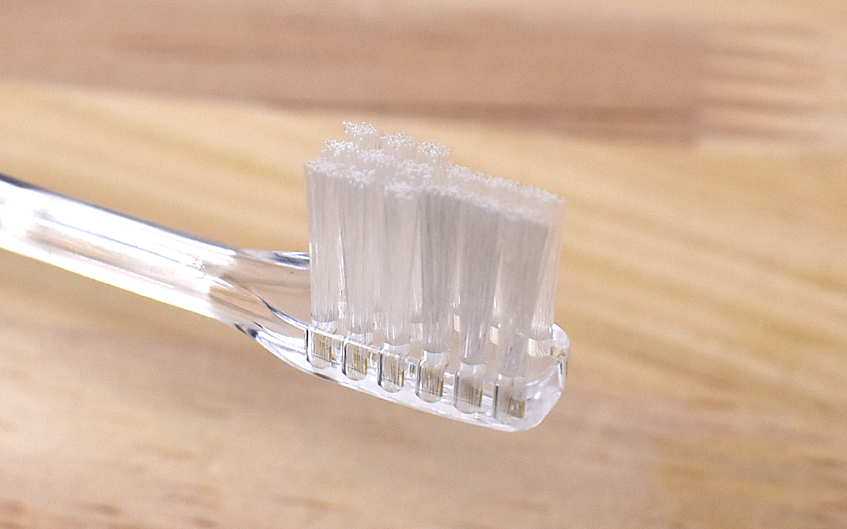 ブラシ全体が「ナノシオンドリーム」というナノミネラルコーティングで覆われており、毛先を水につけるだけで汚れをきれいに取り除くことが可能。「MISOKA V」はV字とフラット2種類の毛先を持ったハイブリット式ヘッドなので、歯間の汚れをかき出しながら歯の表面と歯茎をブラッシングすることができます。試しに軽く磨いてみたところ、歯の表面が驚くほどツルツルに。舌で歯を触った時の感覚がはっきりと変化しました。