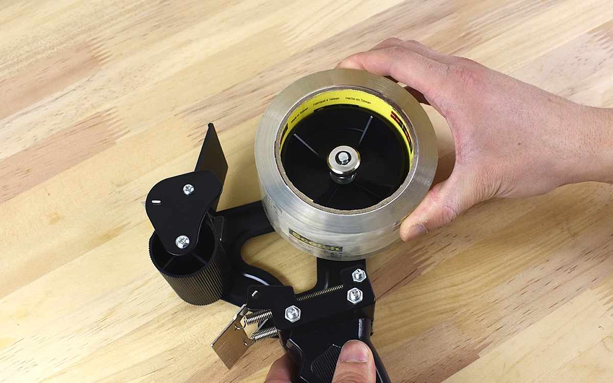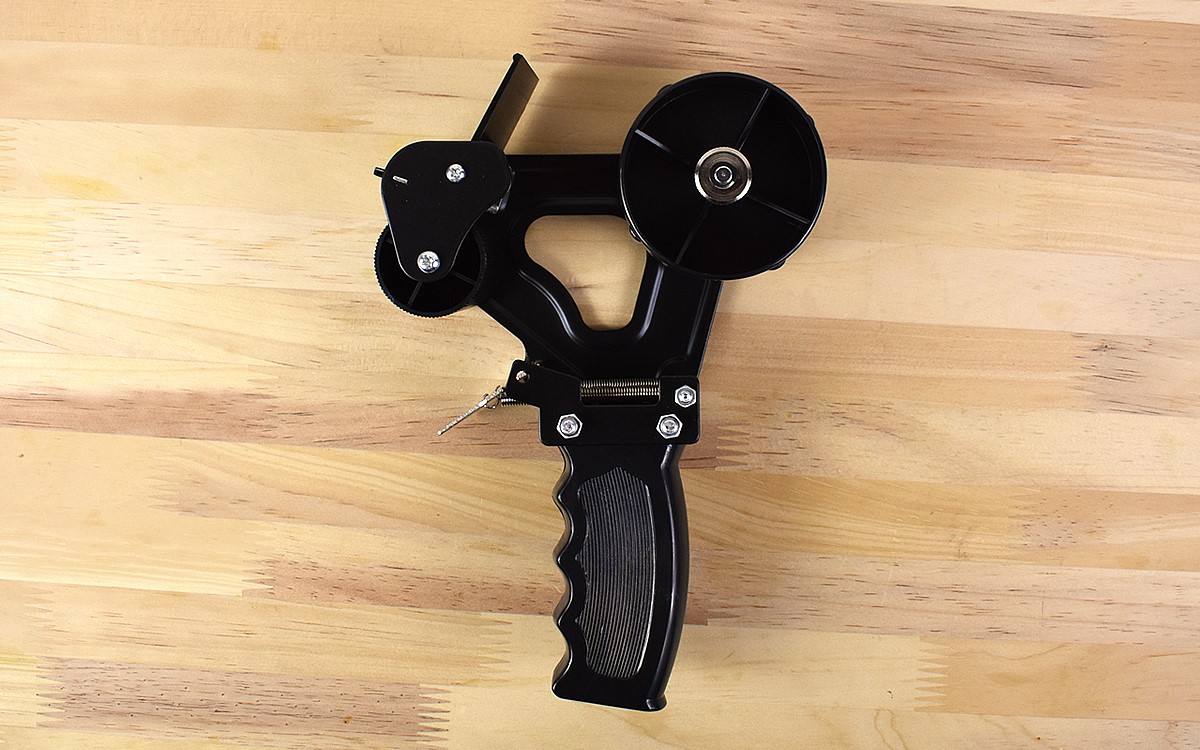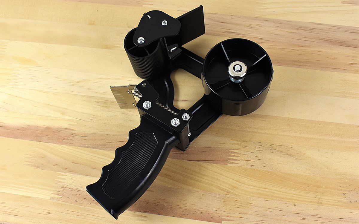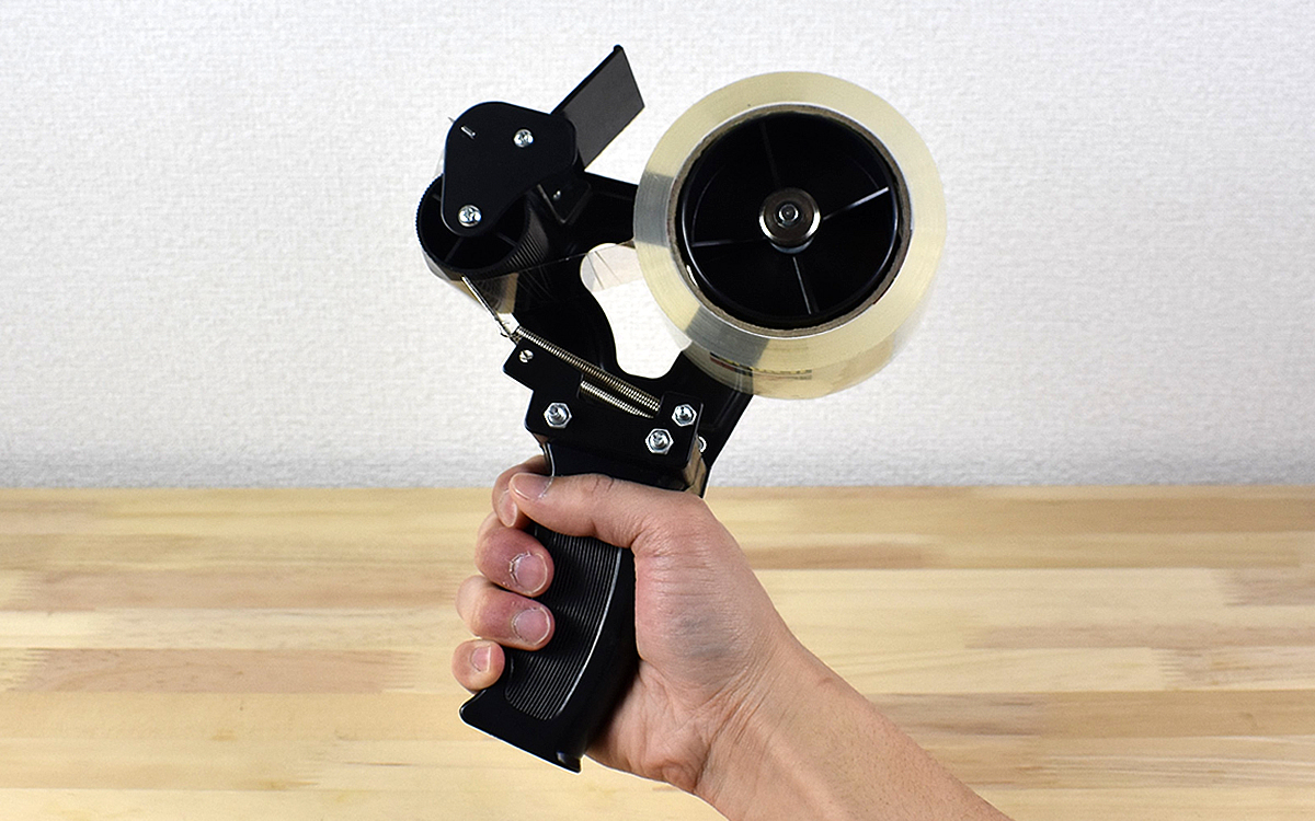 アイアンとステンレススチールを用いた本体に、ハンドガンを模した持ち手がついている同商品。大きさは245(高さ)×165(幅)×75mm(奥行)ほどで、芯の直径が約75mmのテープを装着することができます。
