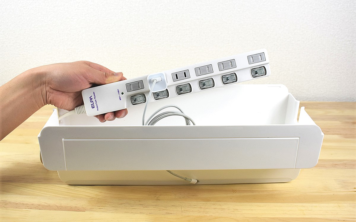 まずはボックス上部にあるフタを開け、コンセントに繋いだタップをセット。タップの1つに充電ケーブルを差し、先端をボックス前の穴から引き出しましょう。