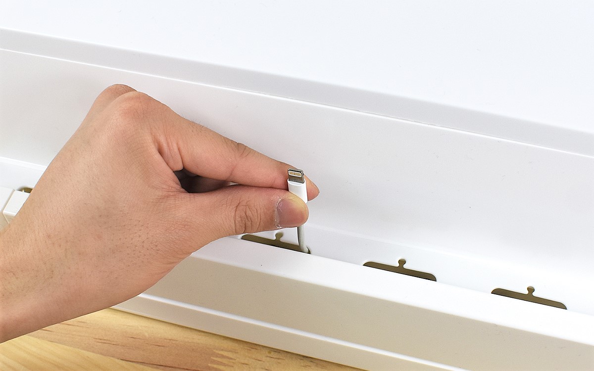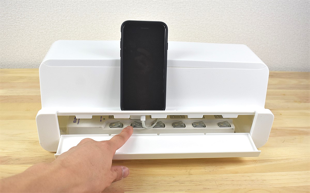 あとはセットしたケーブルに、充電したい端末を繋げばOK。ボックス前面のフタを開けば、タップを取り出さずに電源のオン・オフを切り替えることもできます。