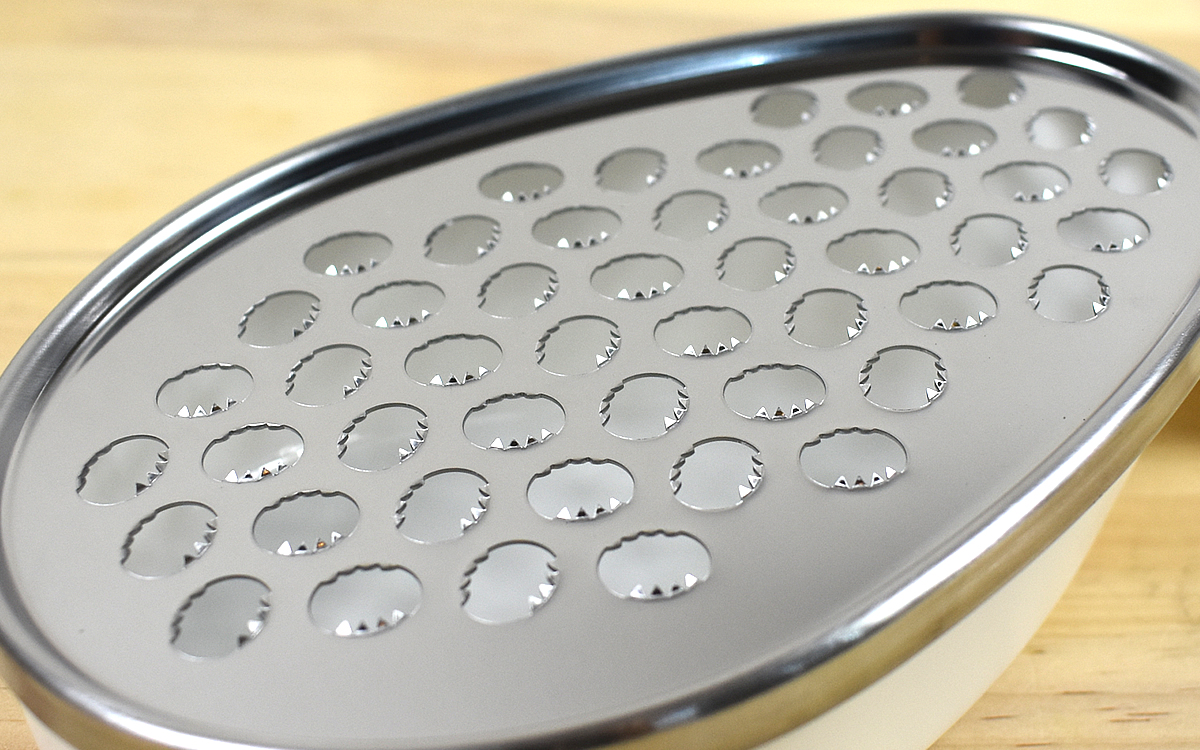 このおろし器の特徴は大きさだけでなく、ランダムに配置された刃の形状もポイント。目詰まりしにくく切れ味が抜群なうえに、おろし方によって食感を変えることが可能です。