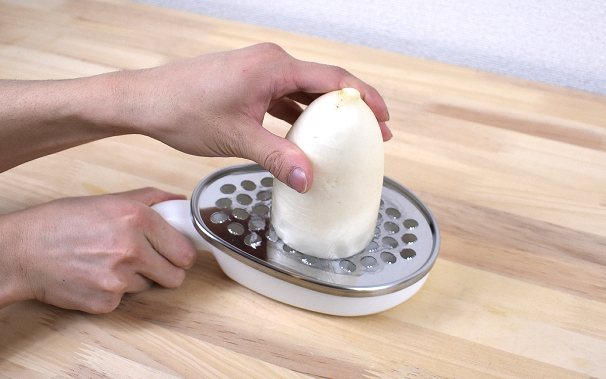 例えば、器をまっすぐ持って野菜を縦に動かせば、シャリシャリとした粗い食感のおろしに。一方、焼き魚やてんぷらなどに添える場合、円を描くようにくるくると野菜を動かす方法がベスト。細かくおろされた野菜がふっくら立ち上がり、やわらかい食感になります。