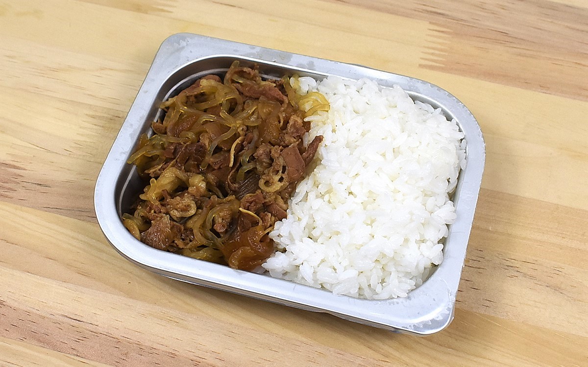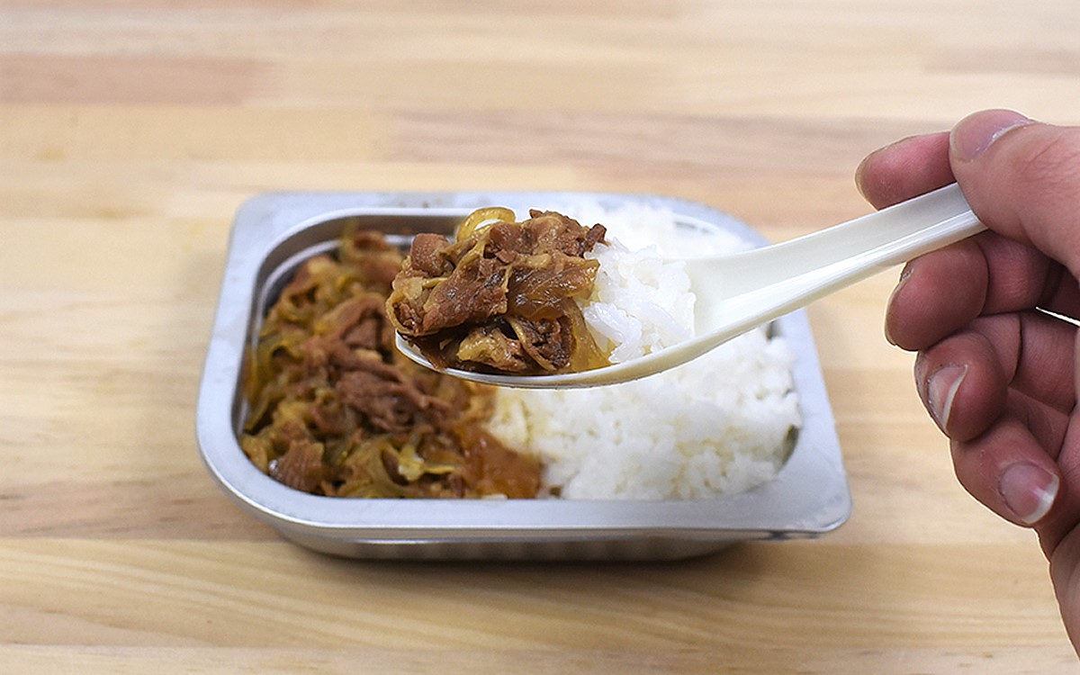 約20分間温めた後に、そのまま箱の中で10分ほど蒸らせば加熱終了。ごはんの器に肉を盛りつければ牛丼の完成です。ひと口食べてみたところ、肉の旨味もごはんの甘さもしっかり楽しめる立派な牛丼の味。未開封の状態ならおよそ3年6か月は保存できるため、いざというときにぴったりです。