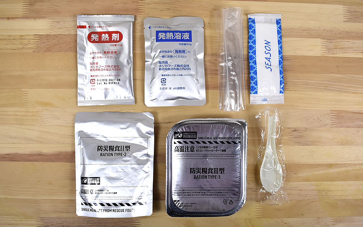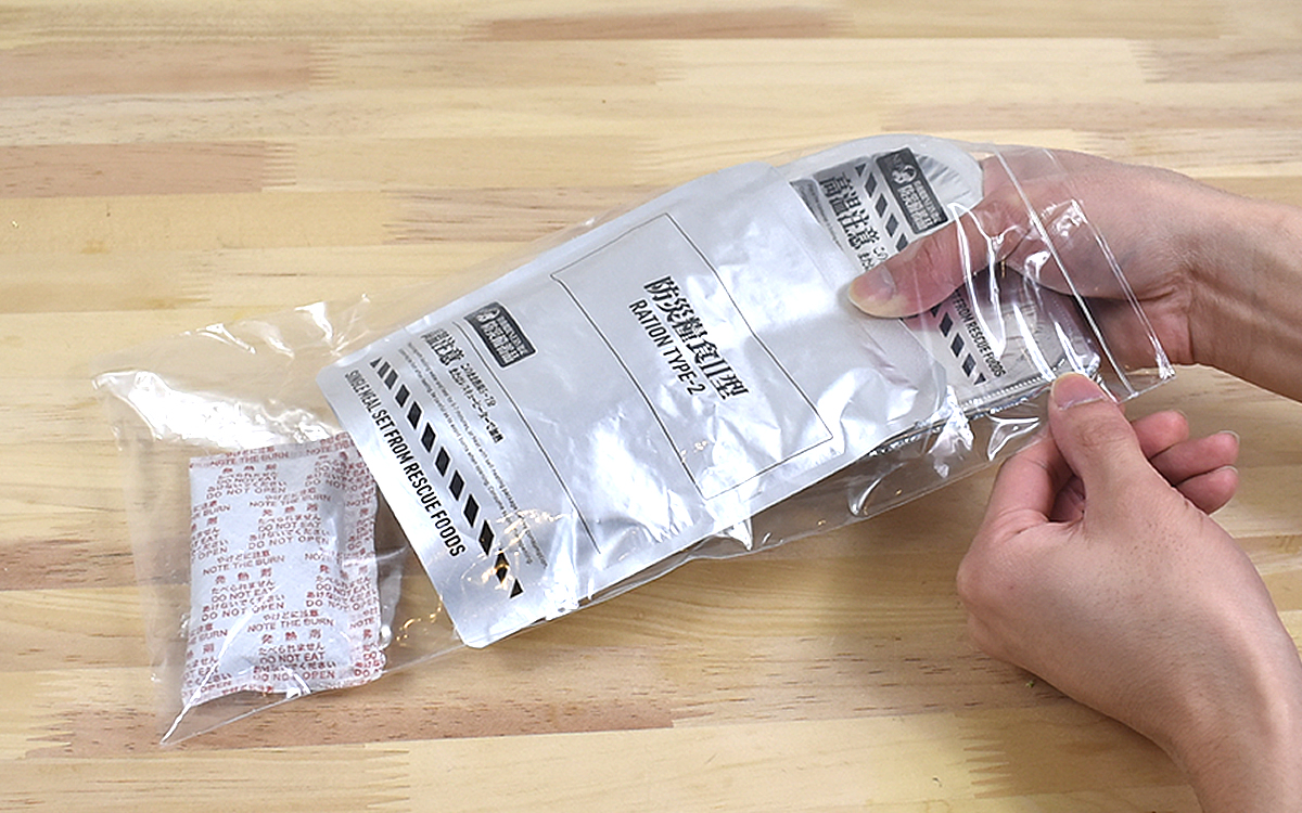 中に入っているのは、白米と牛丼の素、そして発熱剤や発熱溶液、外袋、レンゲ、紙ナプキンといった食事に必要な一式。箱の中に外袋をセットし、発熱剤と発熱溶液を使って食品を温めることができます。