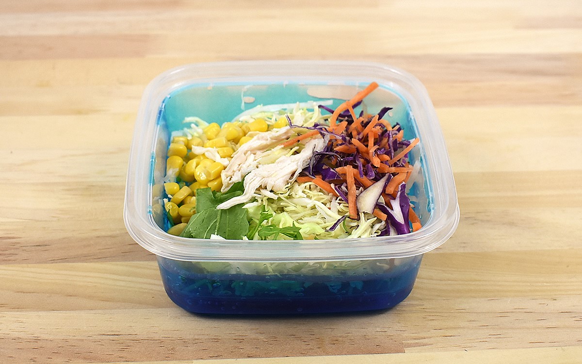 さっそくSサイズの容器にサラダを詰めて、そのまま冷凍庫へ。翌朝取り出してみたところ、保冷ジェルがしっかり凍って、外側まで氷のように冷たくなっています。しばらく室温で放置してみても、ジェルはなかなか溶けずに冷たいまま。中のサラダも、ずっと冷蔵庫で保管していたような味わいでした。