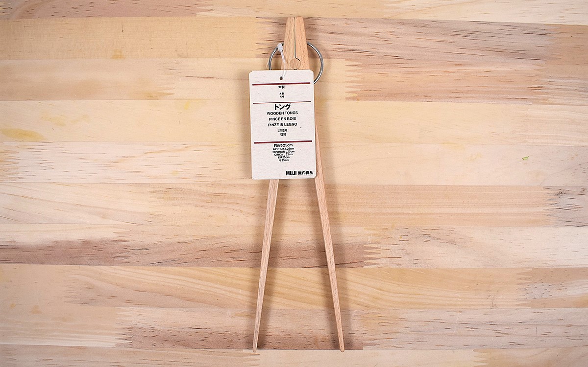 例えば数人で集まって鍋や大皿料理を食べる時は、食材を投入したり菜箸があると便利。しかし、煮込まれた野菜やツルツルとした麺類は、菜箸で上手く掴めないことがありますよね。代わりにトングを使っている家庭も多いようですが、今度は崩れやすい豆腐のような食材を取り出すのが大変。なんとか1つのアイテムで上手に食材を扱いたいと考え、無印良品の「木製トング」(1590円/税込)を購入してきました。