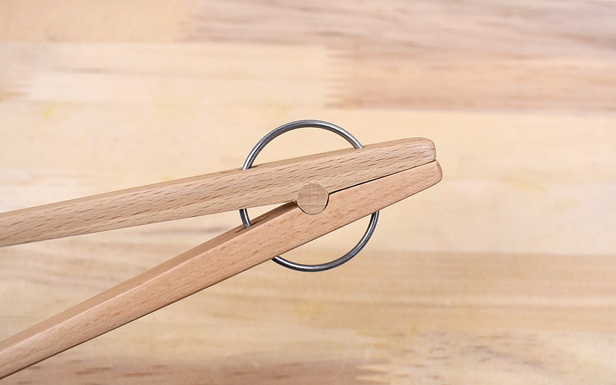 根元の部分には丸い金具がついていて、洗濯ばさみのような構造。両側から軽く握ると、先端がきれいに揃った状態で閉じることができます。また、箸のように転がり落ちる心配もないため、鍋の中や皿の上にそのまま置いてOK。とてもシンプルな作りなので、使ったあとのお手入れも簡単です。