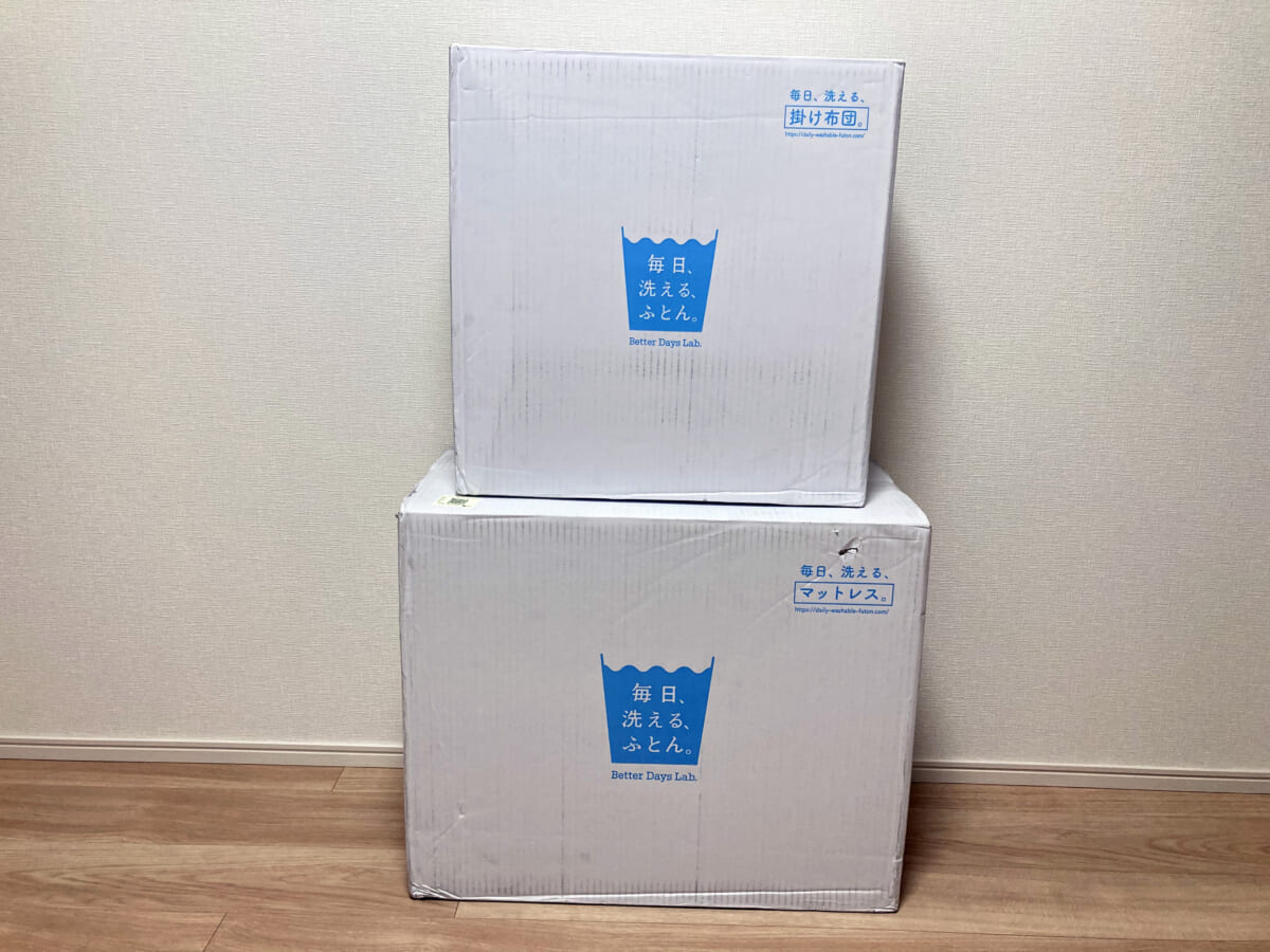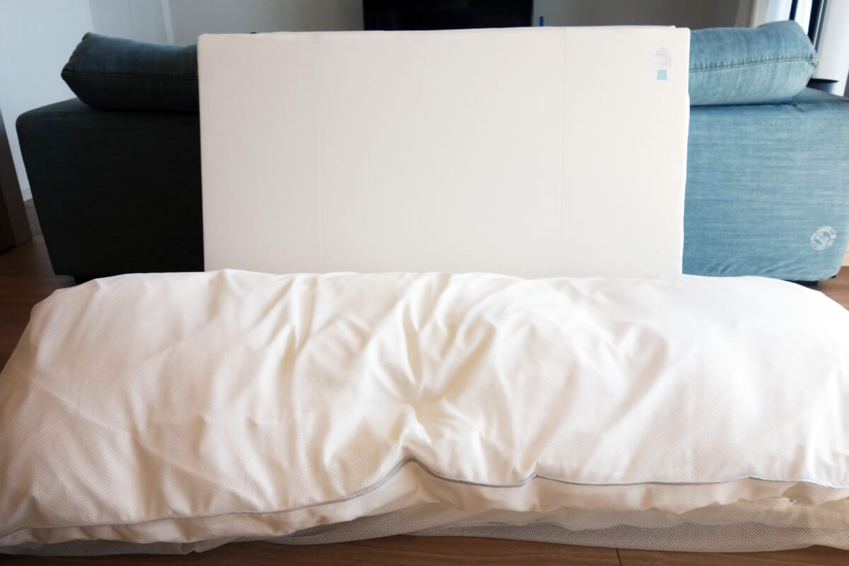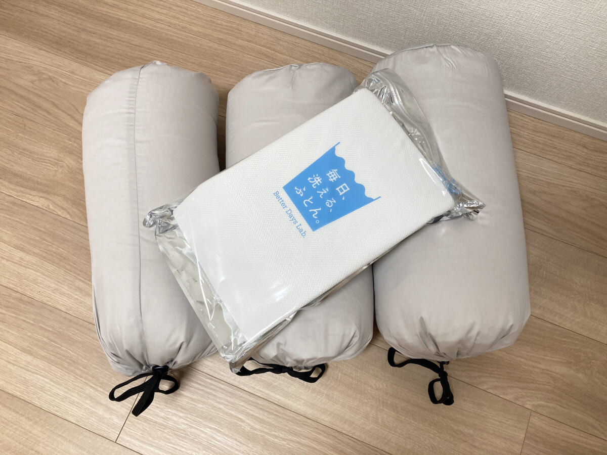 届いた時にはその大きさに驚きましたが、『洗える』という側面から考えてみると、マットレスや掛け布団が3つに分かれているというのは、持ち運びしやすく洗いやすいのでポイント高いですよね。