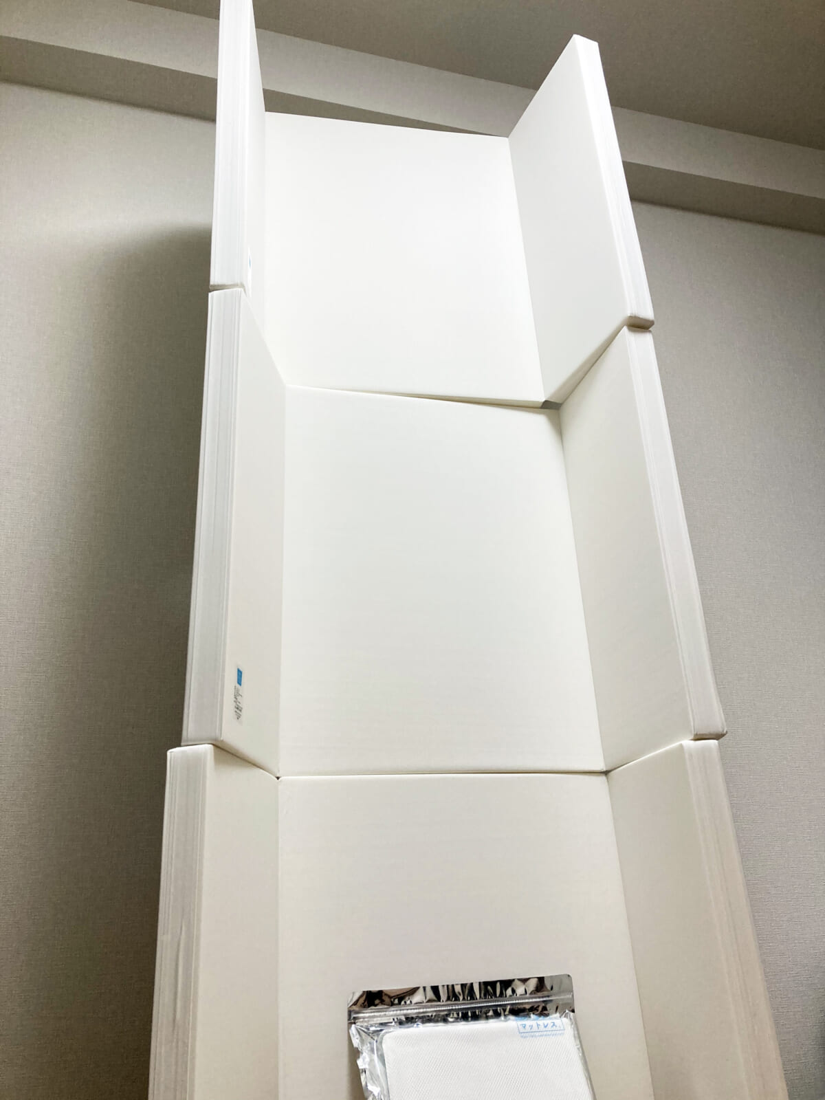 まずマットレスですが、3つ折状態のものが3セット入っていました。広げて縦に積むと見上げるような大きさで、圧巻の迫力。