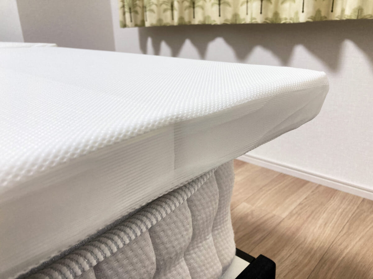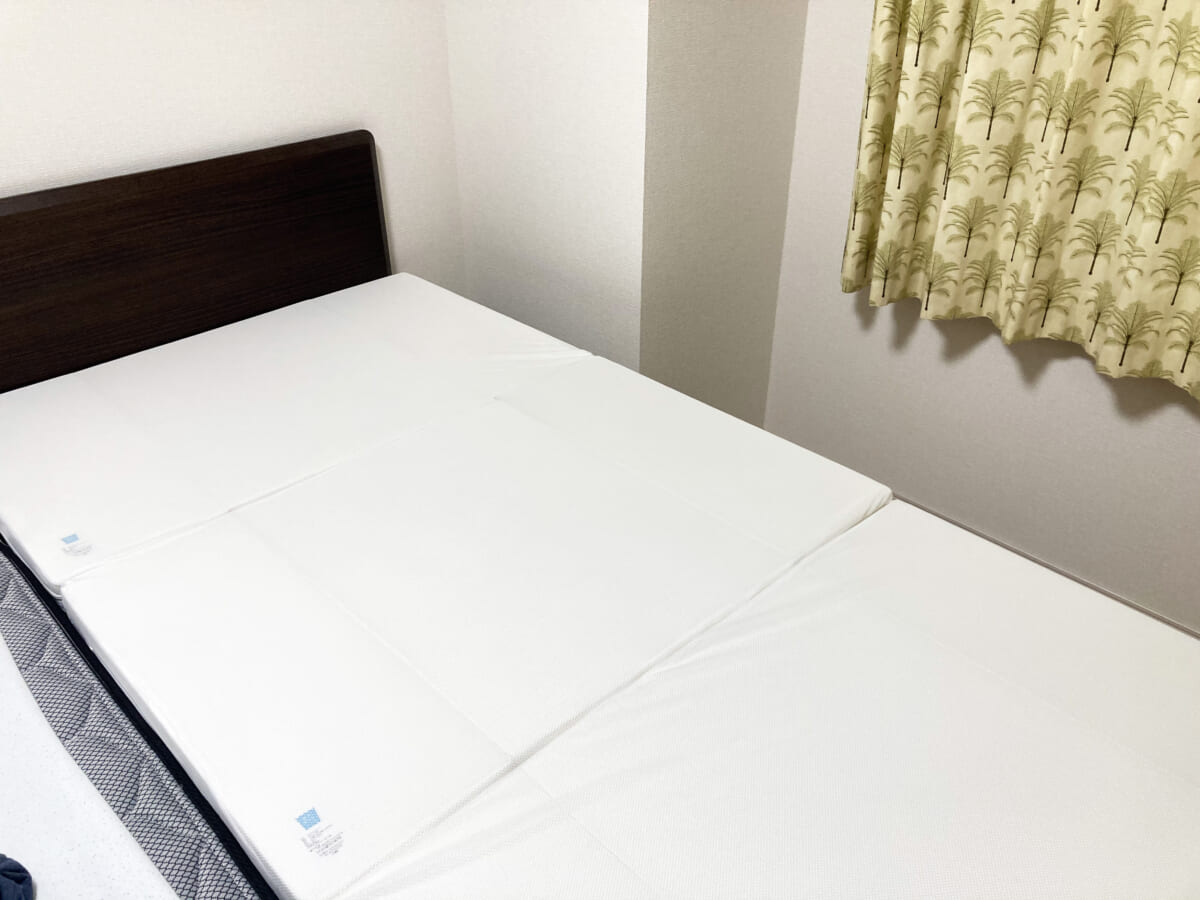 そのままマットレスの上にシーツをかけて寝ても大丈夫ですが、普段、敷き布団を使っている方はその下に使うのが良さそう(私は普段ふわふわマットレス派なので、敷布団をしいちゃいましたw)。マットレスは好みもあるので、ふわふわのマットレスを使っている人にはちょっと硬いと感じるかもしれません。ただ、腰痛に悩んでいる方や硬めが好き、床にマットレスを敷いているなんて人にはちょうどよい硬さだと思います。