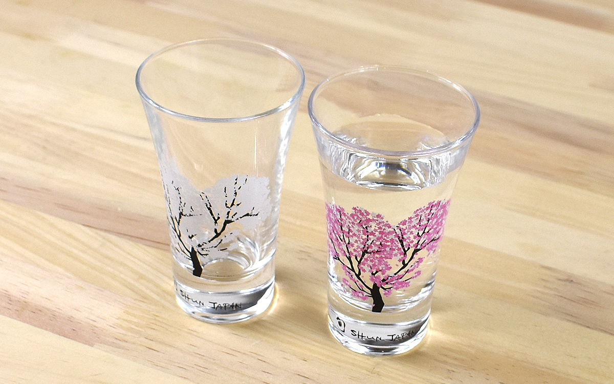 それではさっそく、グラスに冷やした日本酒を注いでみましょう。しばらくすると白かった桜が鮮やかなピンク色に変化していきました。実は桜の絵柄に特殊なインクが使用されており、17度以下の飲み物を注ぐと色が変わります。17度以上になると元に戻る仕様なので、繰り返し何度でも楽しめます。本物の桜を見なくても、思わずお花見をしているような気分になりました。