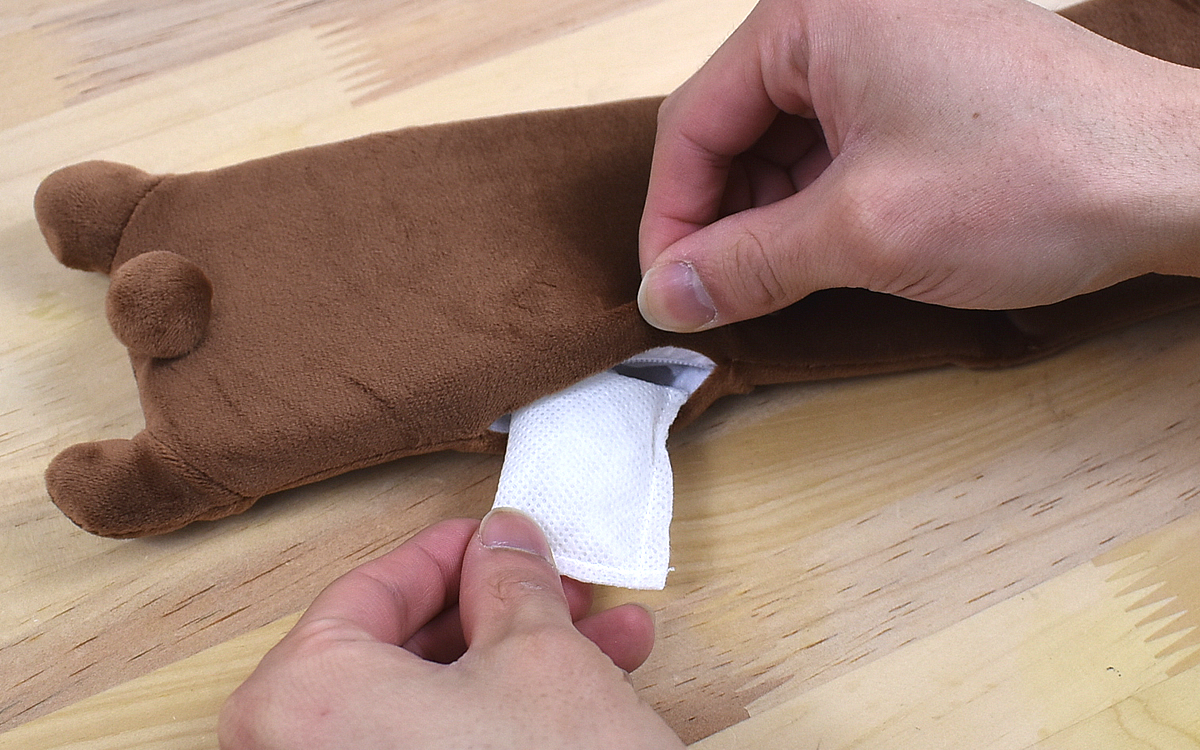 クマのおなか部分には、付属の香り袋を入れられるポケットが。セットするとほんのりラベンダーの香りが漂い、癒し効果がアップします。本体はコンパクトにたためるため、自宅だけでなく外出先やオフィスに持って行ってもOK。いつでも快適にデスクワークができますね。
