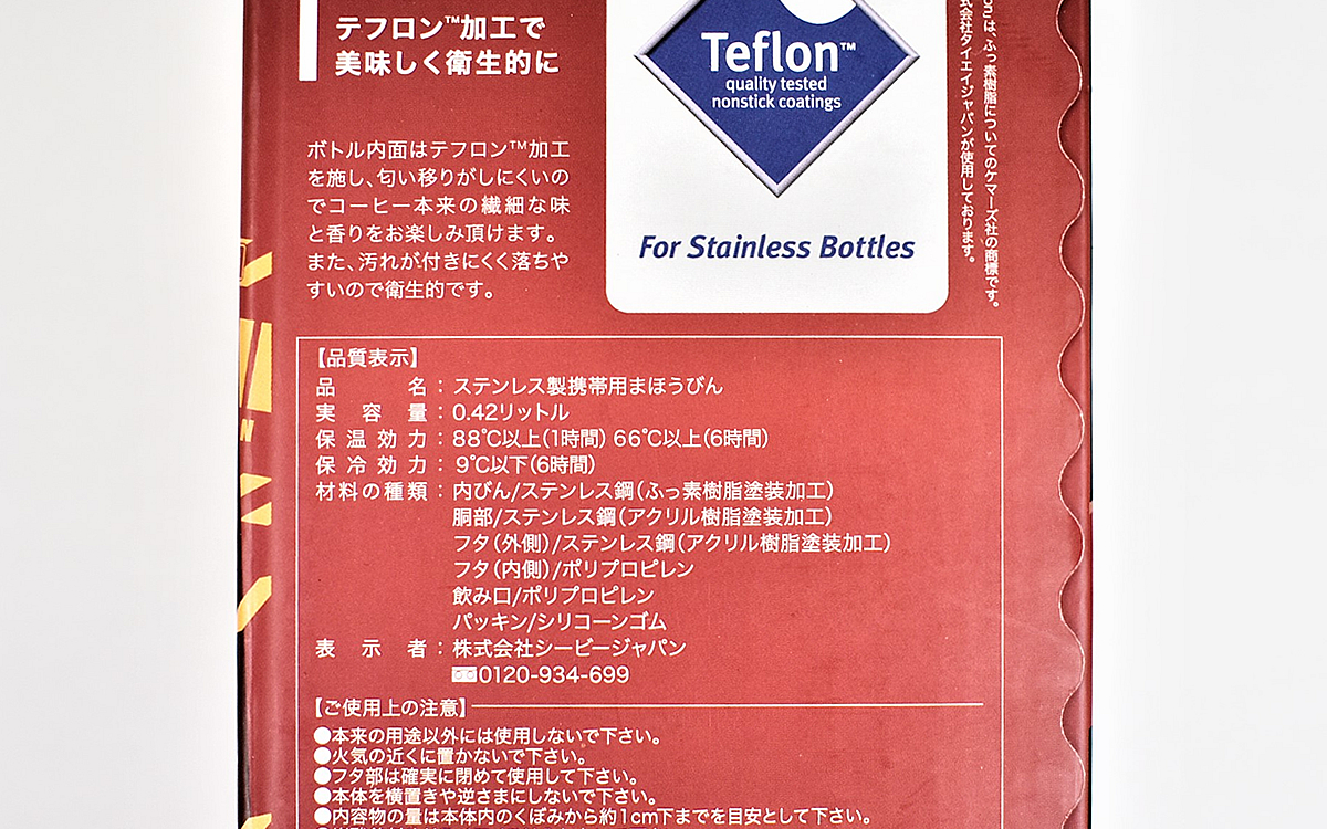 本体は真空2層構造なので、ホットとアイスどちらで使ってもOK。さっそくアツアツのコーヒーを注いで味わってみたところ、温度がキープされてコーヒー本来の味と香りをじっくり楽しむことができました。ボトルの内側には、匂いや汚れがつきにくい「テフロンTM」加工を採用。お手入れもしやすく、清潔に使えるボトルです。