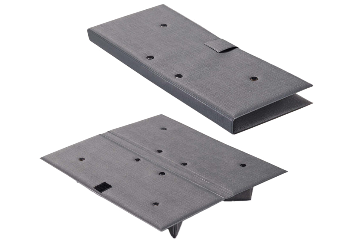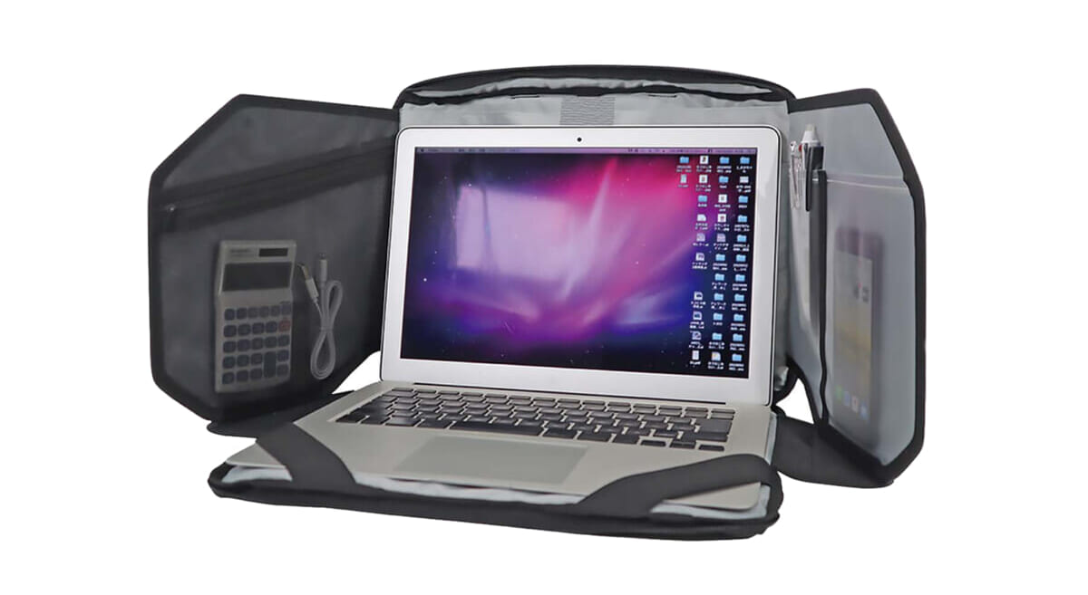 開けばすぐに作業ができるノートPCカバー。6つのポケットと、付箋を貼り付けられるスライド式のボードを備える。スタンドタイプは、机に触れる面に折りたたみ式のスタンドがある。