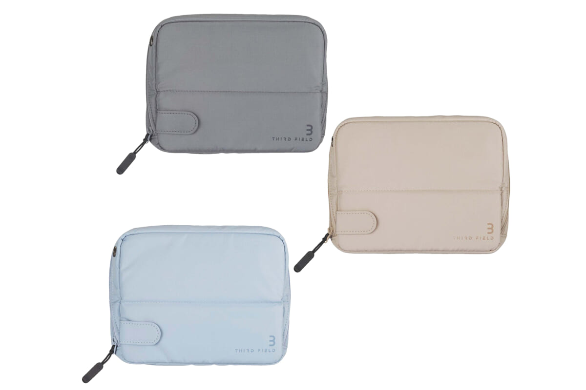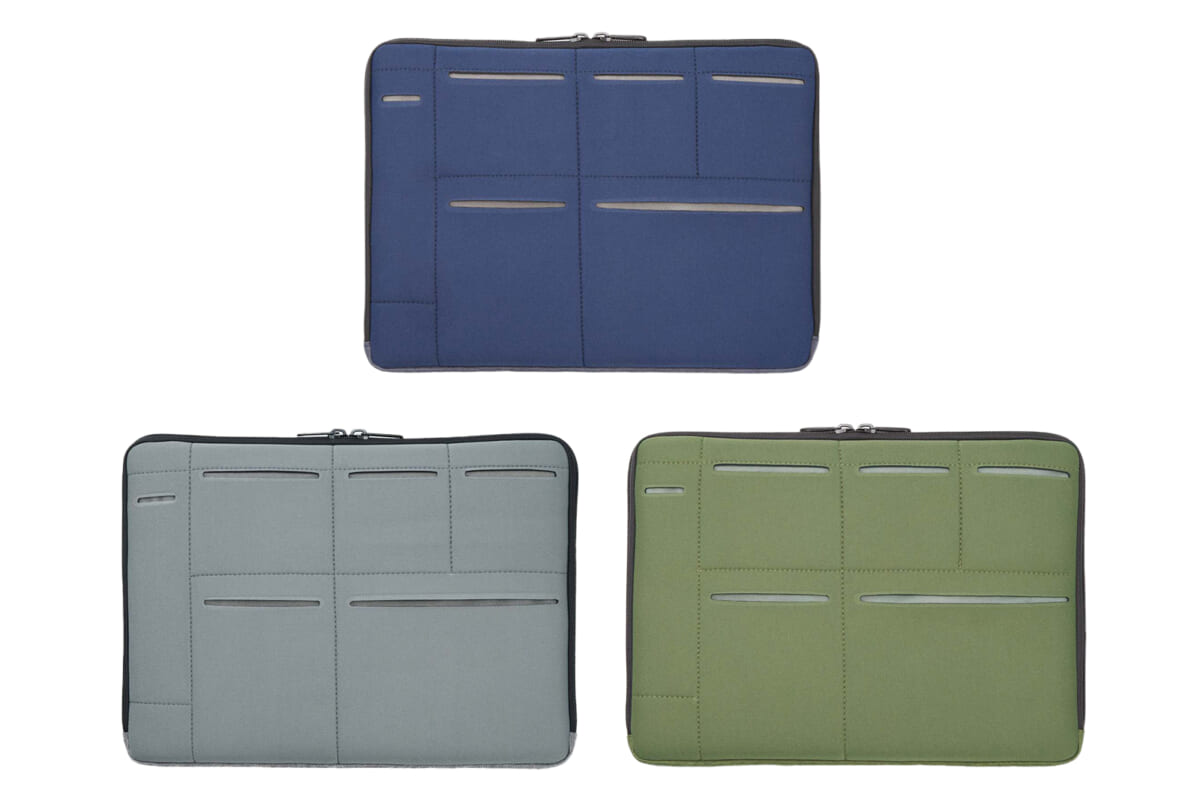 広げると仕切りになり、周りの視線をブロックできるノートPCケース。13インチまでのPCやタブレットと、仕事道具をまとめて持ち運べる。生地は、中身を水濡れから守る強撥水タイプだ。