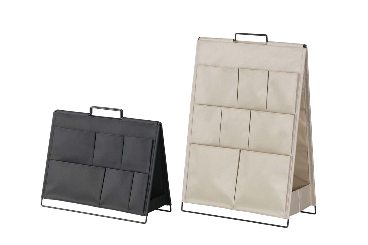 立て看板のように自立し、ハンドルを持ってそのまま持ち運べる。両面に大小様々なポケットを備え、収納力は抜群。広げた内側には、箱ティッシュのような厚みのあるモノも入れられる。