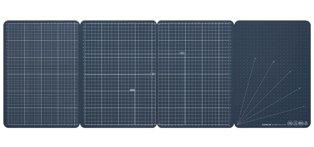 A4を縦向きにして、横に4枚繋げたサイズのカッターマット。折りたためばA4やA3サイズになり、コの字型に広げて立てればパーテーションにも。工作に便利なガイドが印刷されている。