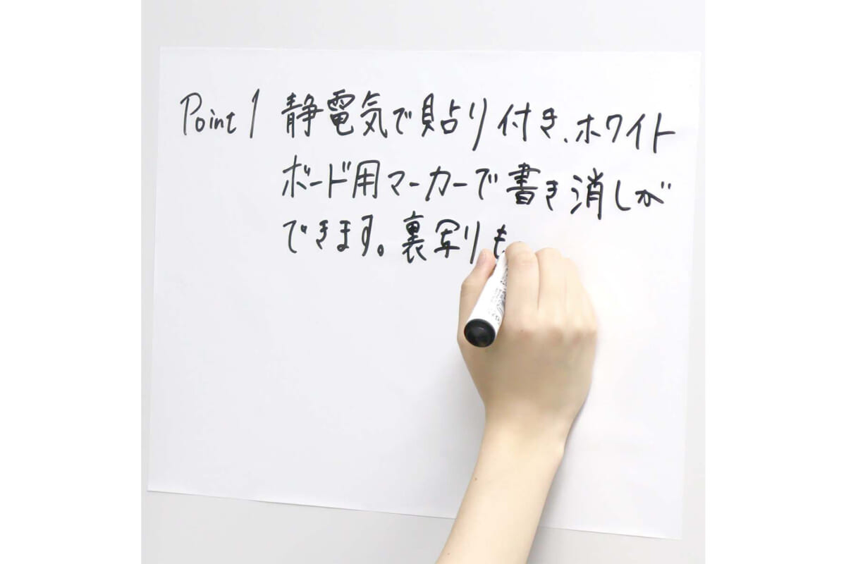 静電気で壁などに貼り付き、ホワイトボードのように使えるシートのA3タイプ。平滑面ならガラスや木などにも貼れ、繰り返し貼り剥がしできる。裏写りしないため、表と裏どちらも使える。