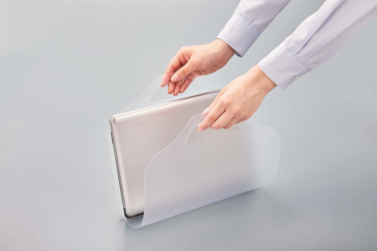 共有デスクなどで、置いたものがテーブルに触れるのを防げて衛生的。両端に持ち手があり、仕事道具をくるんだ状態で移動できる。くるんだままA4サイズのカバンに入れることも可能。