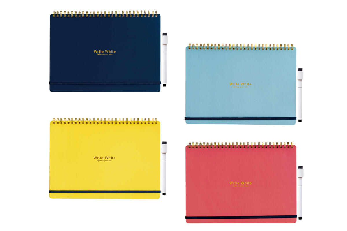 ノート型のホワイトボード。各ページの間にある透明シートが、書いた内容を保護。シートにも書き込みができ、ボードへの追記などに使える。B6タイプは、卓上カレンダーのように自立する。