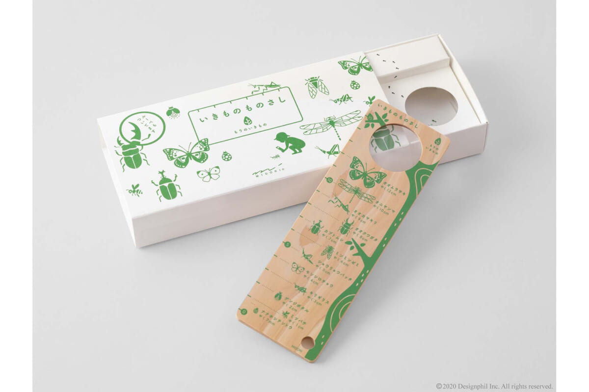 目盛りの横に、カブトムシや蝶などの生き物の絵とサイズが入った木製の知育定規。観察に使えるルーペ付きだ。付属の説明書には、生き物の絵と説明を載せた「いきものずかん」を収録。