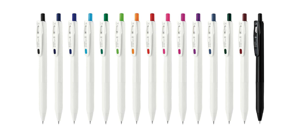 ジェルインクペン「サラサ」の新モデル。従来品より27%濃く書けるインクを使っている。インクは全14色で、黒のみボディが白と黒の2種。ボール径は0.5mm(黒、赤、青のみ)と、0.4mmだ。