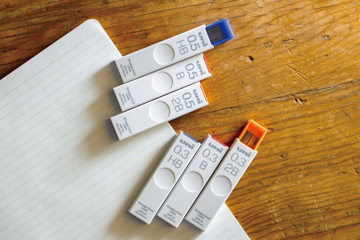 ノック1回で芯がなくなるまで書き続けられるシャープペンの芯径0.5㎜モデル。0.2㎜や0.3㎜よりタフに書ける。芯のサイズに比例して大きくなる筆記抵抗を抑え、滑らかな書き心地を実現。