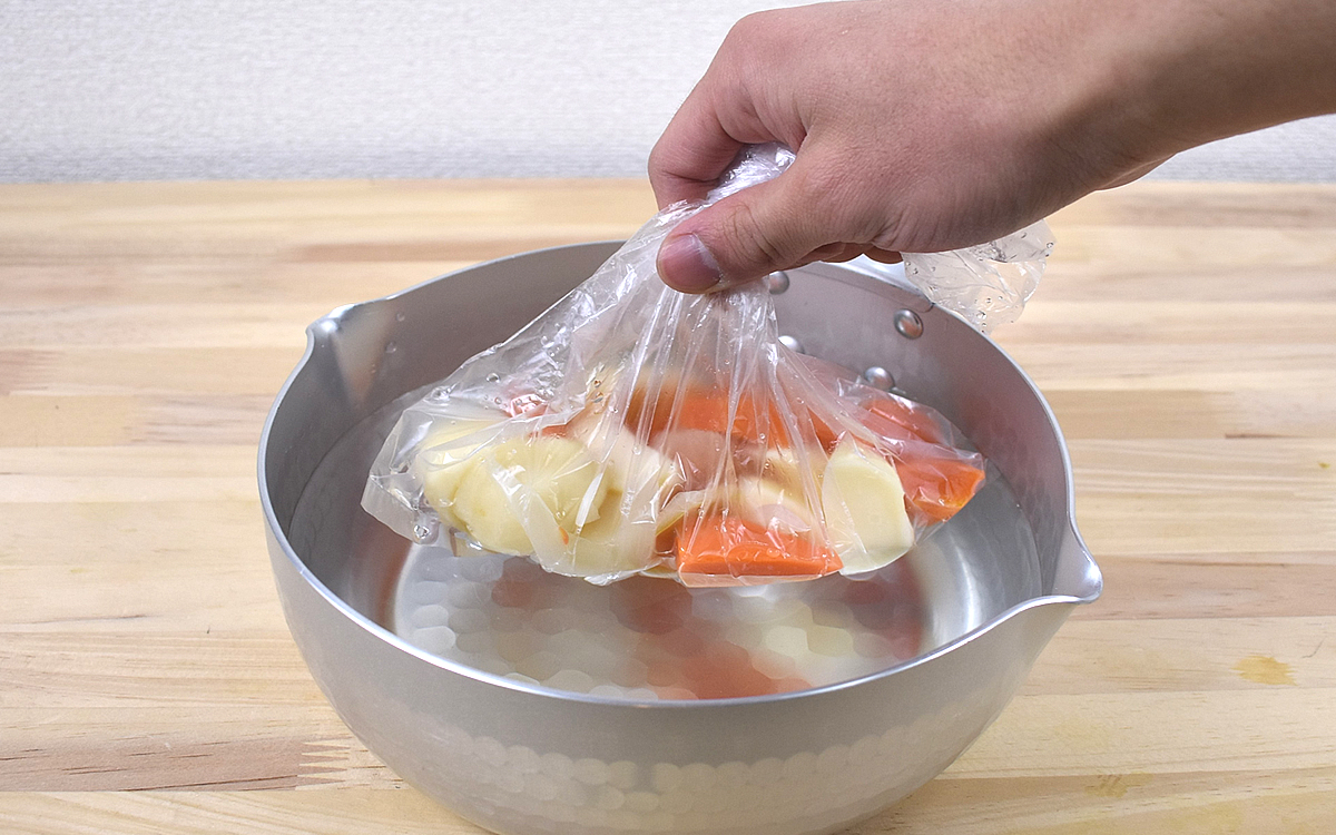 「アイラップ」は食材を保存するほかにも様々な使い道が。冷凍はもちろんのこと、袋に入れたまま電子レンジやボイルが可能で、例えばアイラップで漬け込んだお肉をそのまま低温調理することも。わざわざ袋から取り出さなくても調理できるので、手間と時間の節約になりますよ。