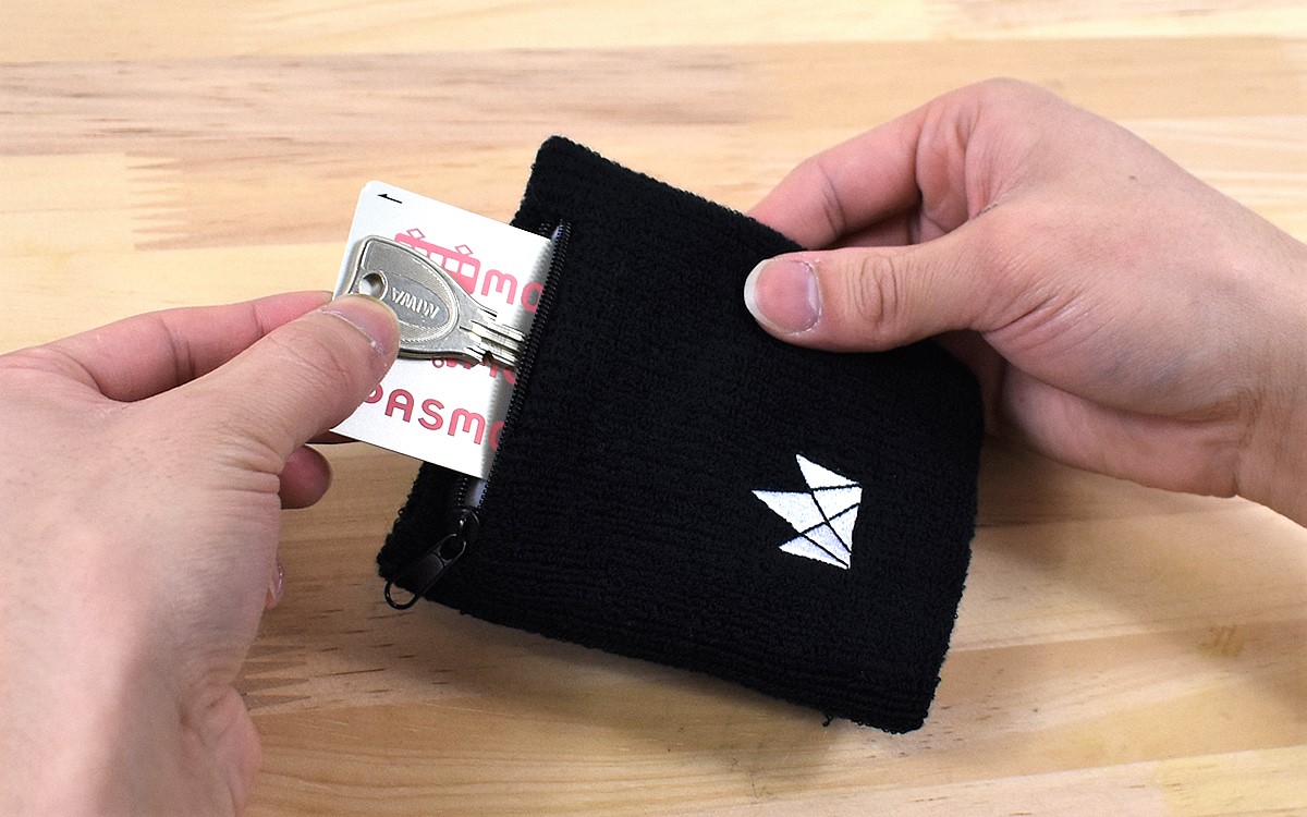 「万能ポケット付きリストバンド 2個セット」は、大きめのポケットとリストバンドが一体化したアイテム。一般的なリストバンドよりも少々縦長サイズなので、クレジットカードや免許証、お札や鍵などの貴重品がすっぽりと収まりました。