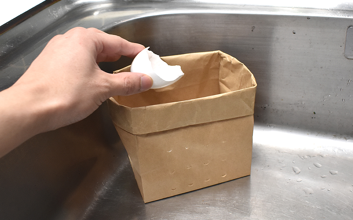 この小さな紙袋の正体は、商品名の通り“紙製の水切り袋”。簡単に説明すると“水切りネット”の紙バージョンです。きちんと自立するので、三角コーナーは必要なし。シンクの隅で生活感を醸し出していたあの容器がなくなるだけで、キッチンの雰囲気も大きく変わります。